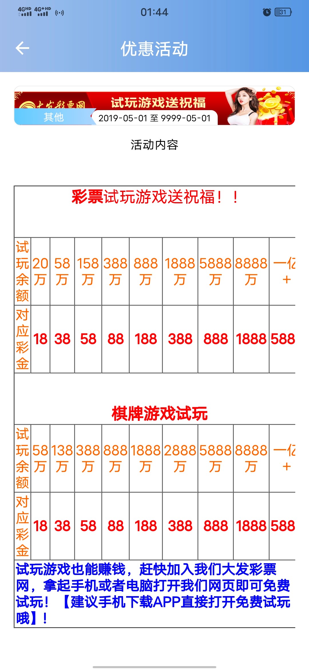 彩票直接试玩登录即可,棋牌注册账号后点进棋牌,直接选玩儿的游戏,点第一个体验厅就行,打到58w就有18,记住打输了可以重新进房间刷新1w额度,但是打到了一定不要退,截图,然后打开浏览器复制粘贴下面网址打开客服找客服领取,切记不要退出房间,退出就清成1w了