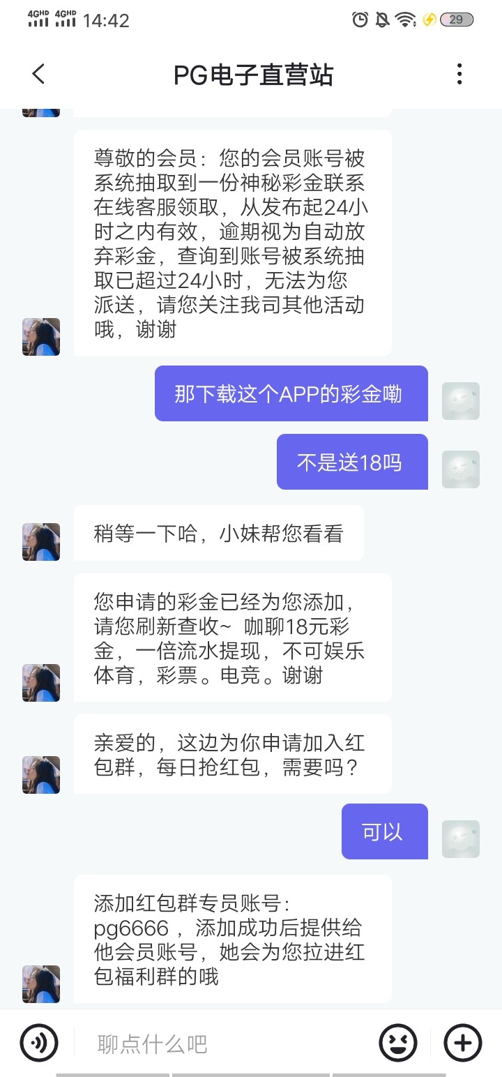 很抱歉,您的下载咖聊彩金暂时未能审核通过,无法派送呢,不过没关系,我把您拉进我们红包群,每天也能抢几十的红包呢。