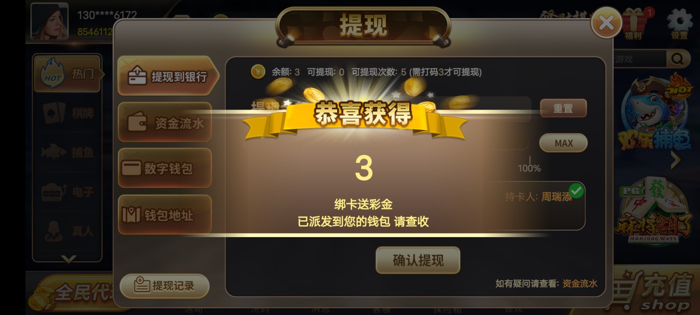 打三下财神捕鱼,爆了就提现,我没爆,都去试试运气