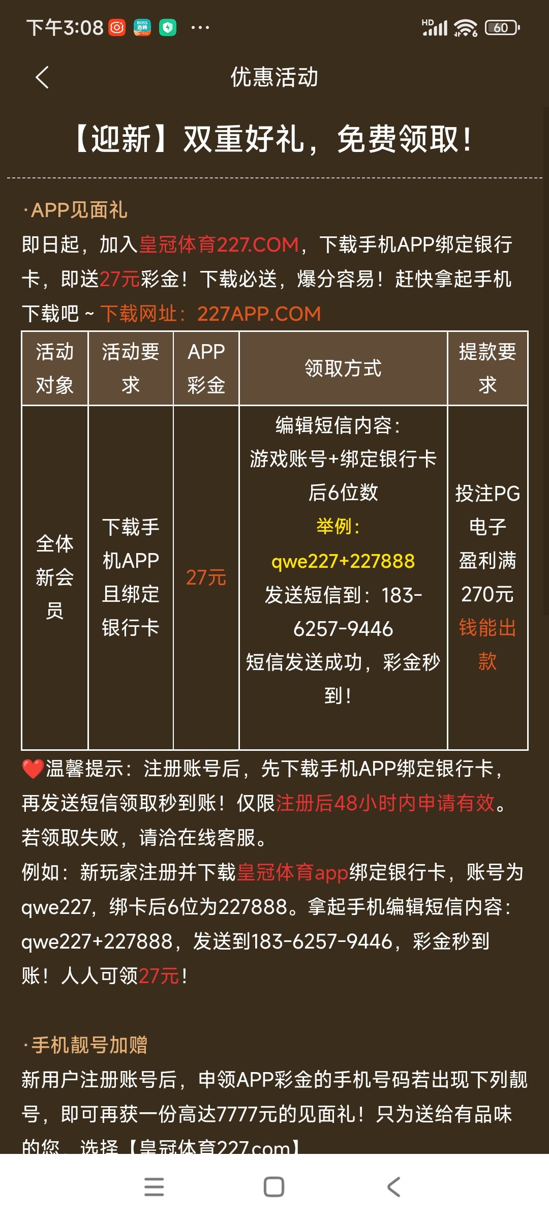 227.com老白菜了,打不开的自己站里搜,我联通5个号全能领和特邀应该无关,是人就有系列。提款自测我没打出来,反正提不了款别来骂我,有能耐你别申请,你红了也不给我!