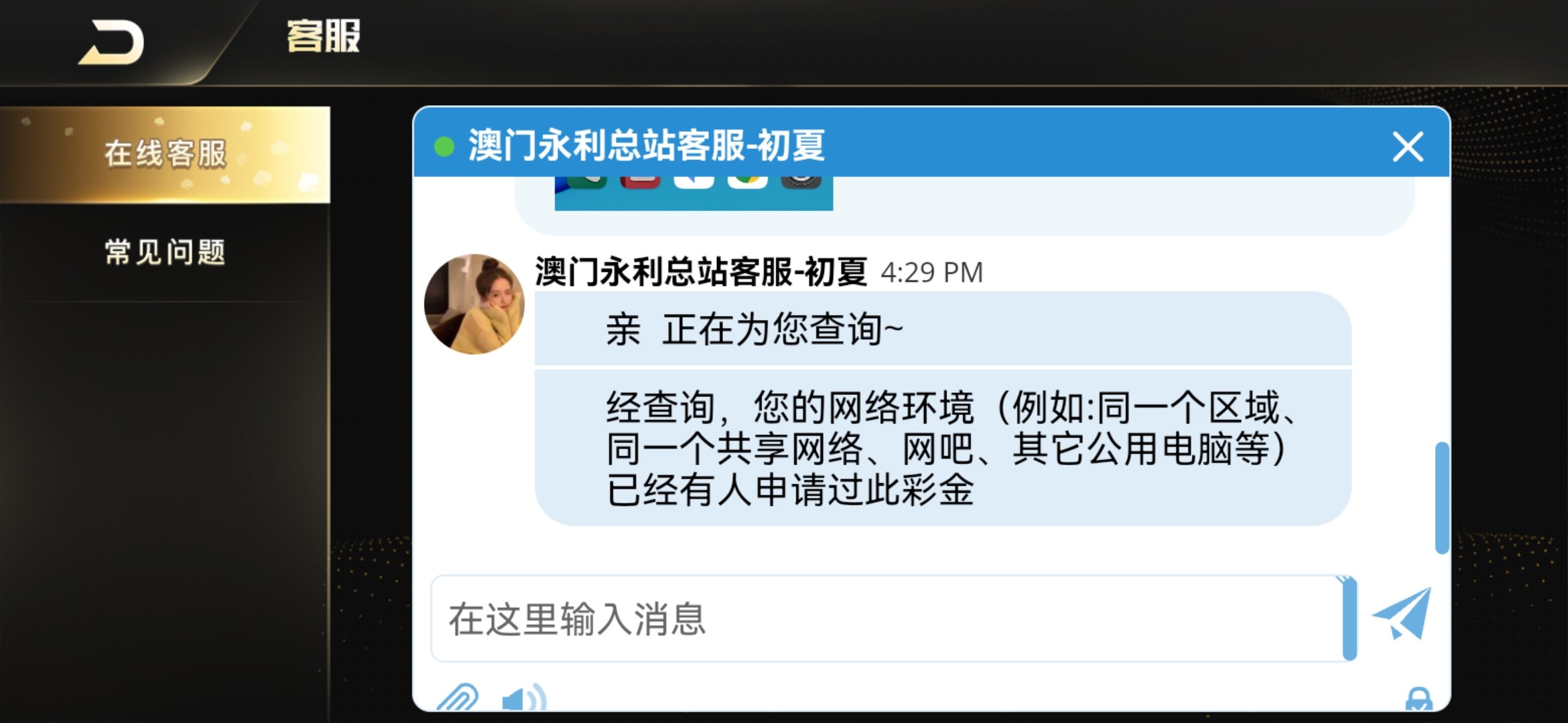 经查询,您的网络环境(例如:同一个区域、同一个共享网络、网吧、其它公用电脑等)已经有人申请过此彩金。参与更多优惠下载APP【澳门永利ylzzdl.com】