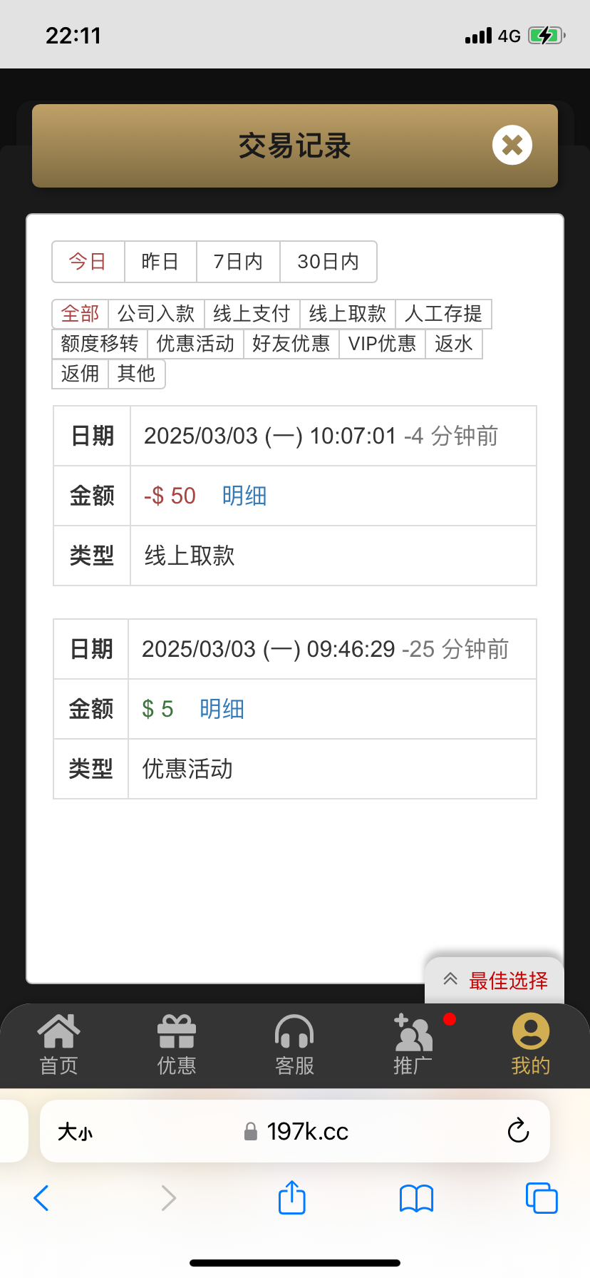 197这个台很杀,我都卸载了,别人说有现金回馈,应该是2月有存款的,有过存款的老哥去看下,反正是不在这个台存款了,5块回馈到50我就走了,我知道它后面肯定会吃掉,不如自己提了吃了