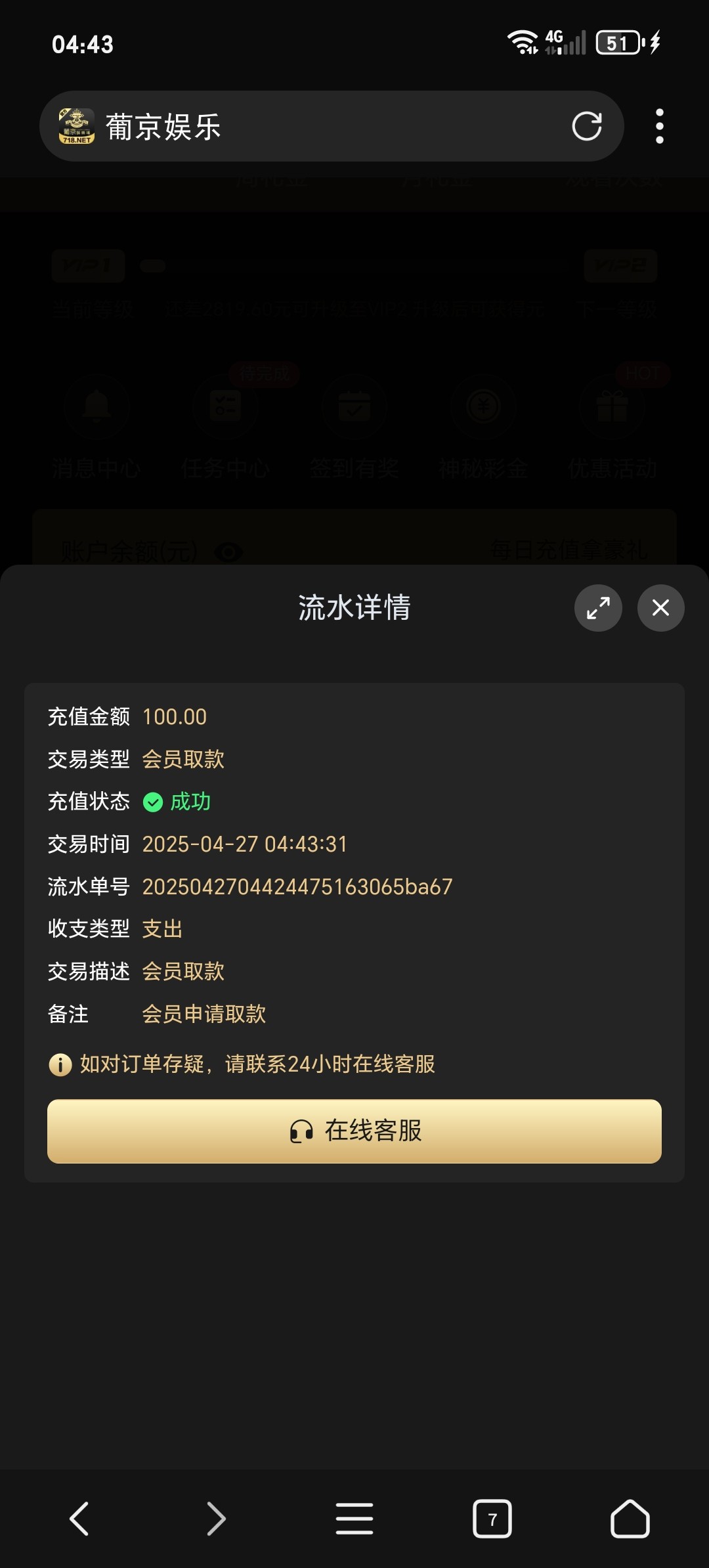 前段时间注册的注册彩金没水没打出来。今天充值了100提了1000