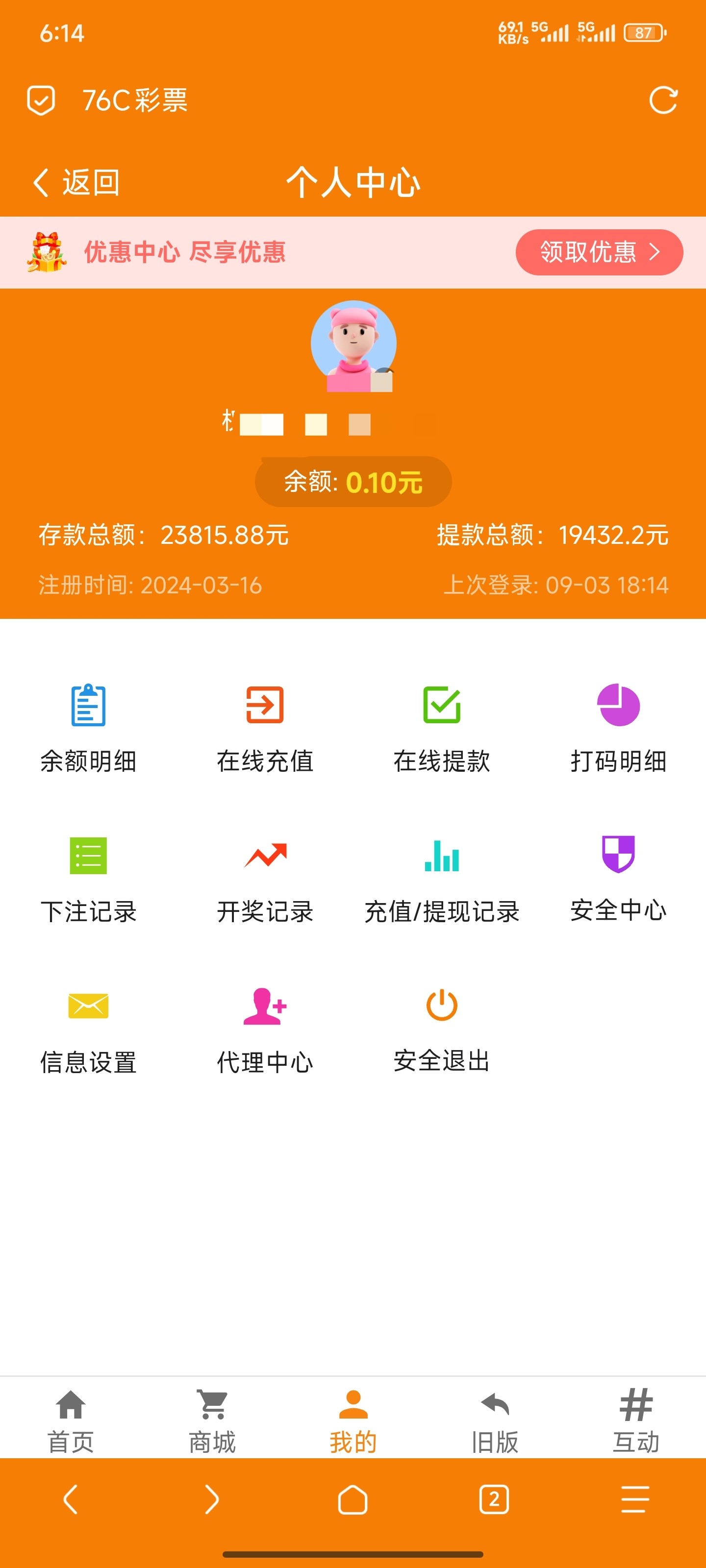 看前几天有人发有关76c彩票的贴就进去看了一下,进去就给了个38彩金,充值过