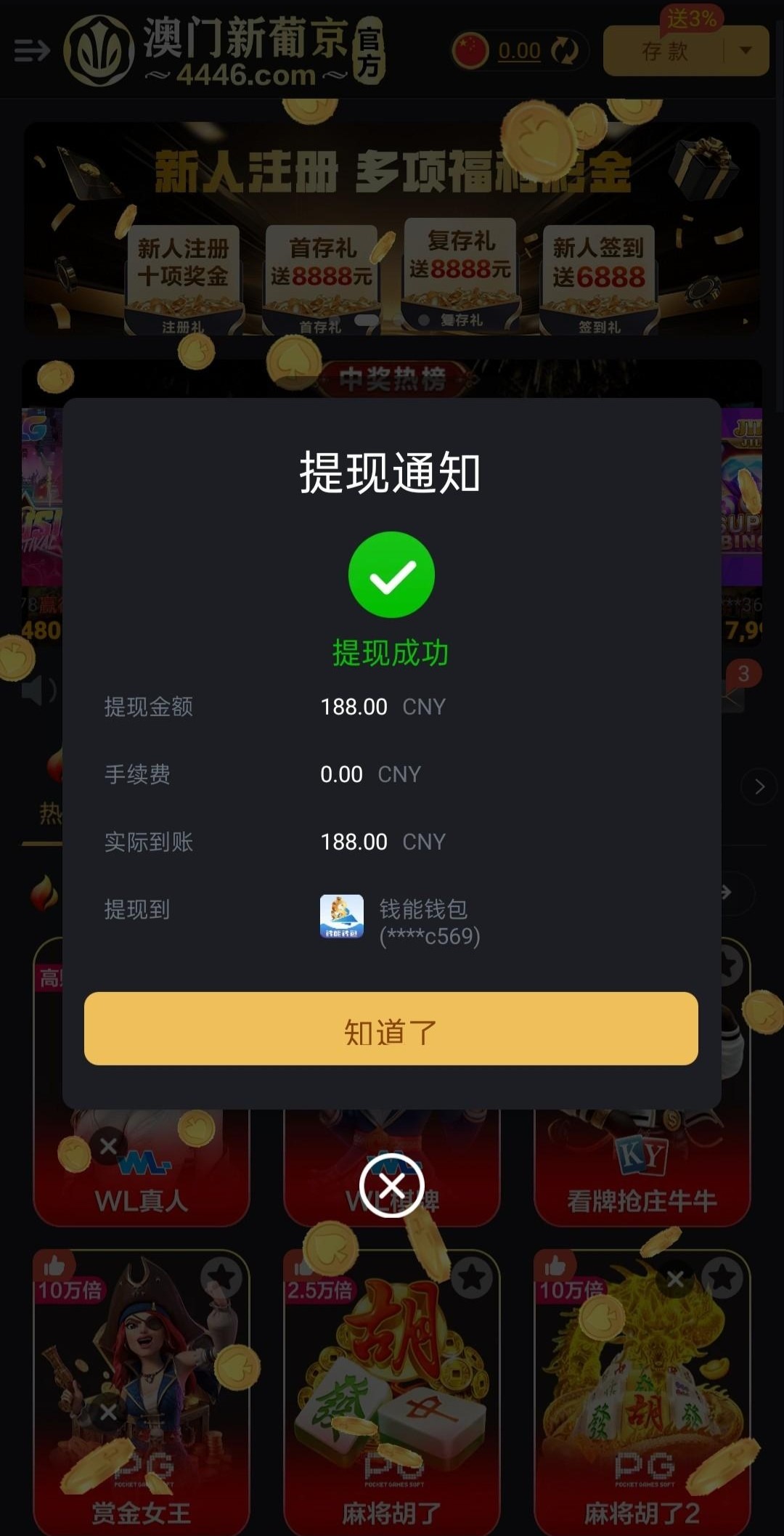 第一张图是老版的威尼斯国际,大家有之前充值过玩过的直接下载新版,新版改名为澳门新葡京,下载地址 4446.com . 下载后用老版账号密码登录新版,直接联系客服申请188,不需要流水可以直接提,彩金派送后老版账号就直接给你冻结了。