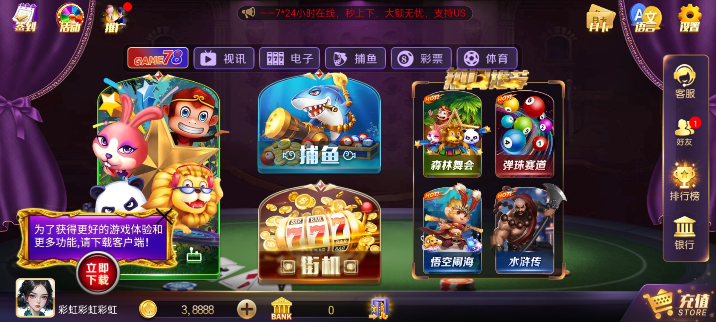 新用户注册秒38888金币彩金不限制游戏,下分在排行榜处,具体自测