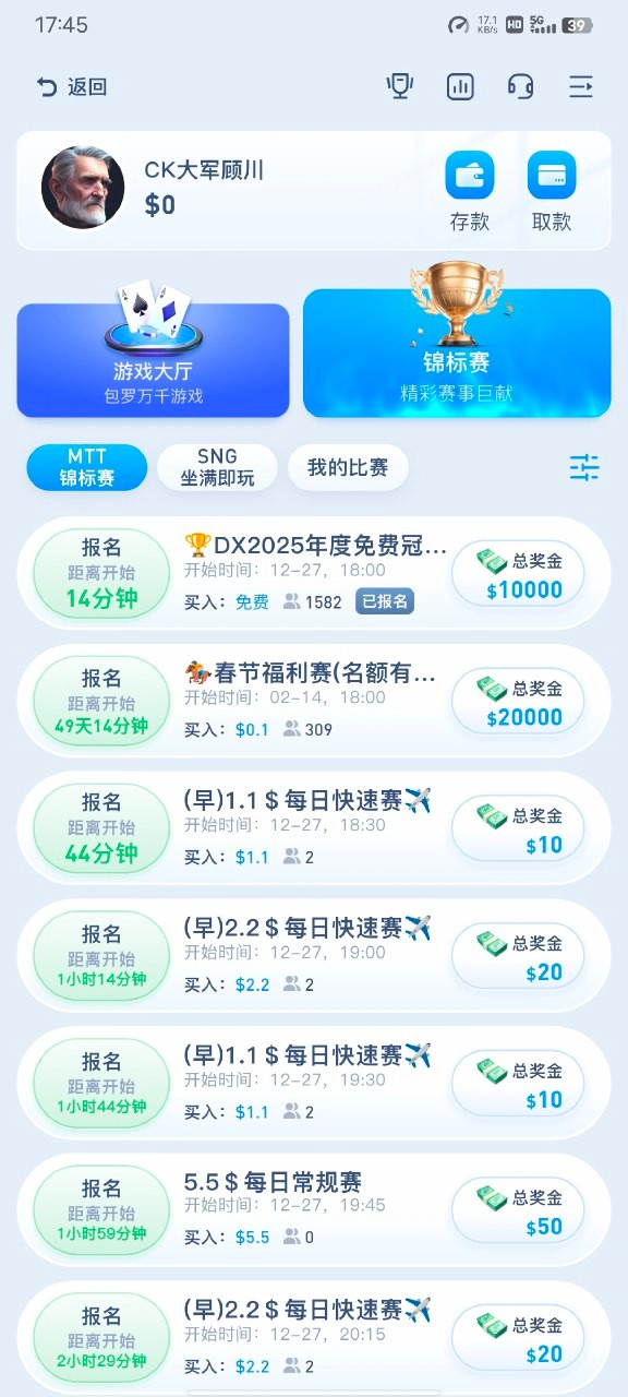 新用户注册大厅mtt锦标赛即可参加,具体活动看规则吧