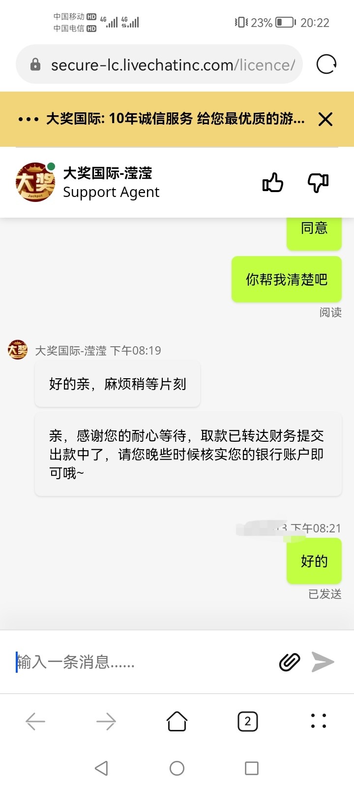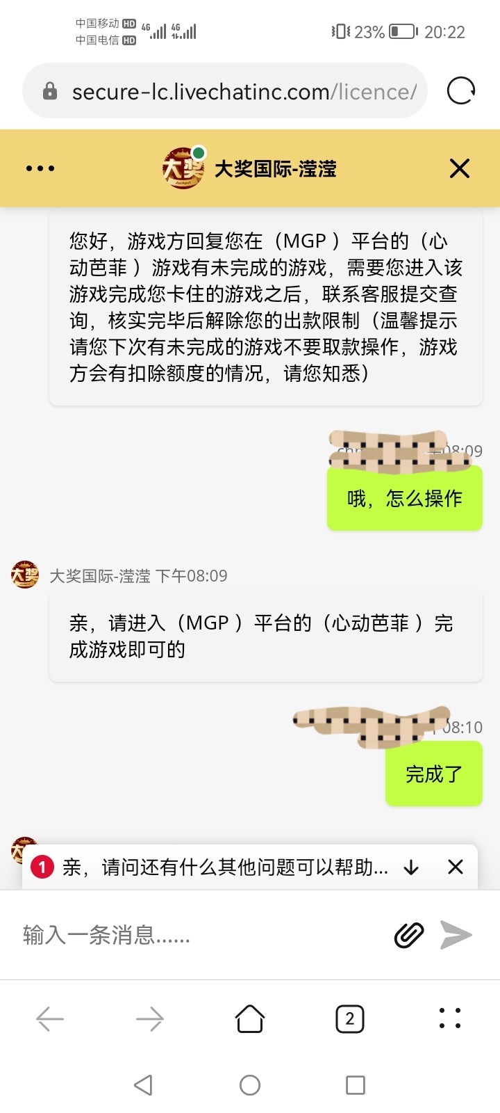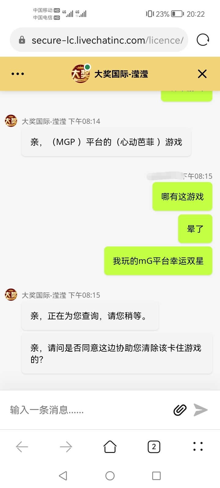 事情是这样,充值打MG幸运双星提了2000到账,剩点零头十多块,又进去转几下到100又提。说我MGP平台(心动芭菲)游戏卡住没转玩,我查了根本没这游戏,我打的是幸运双星。虽然没有黑,仔细想想感觉不对,这些老虎机数据有点假阿