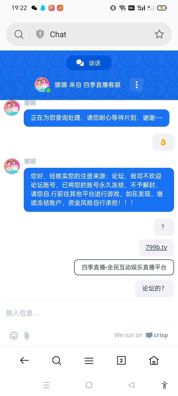 菜狗 娜娜 您好,请您稍等片刻,马上为您查询处理呢,谢谢~~ 好没有 查看 娜娜 您好,并未查询到您的电话记录,暂时无法为您派送彩金,目前我司为新用户推出以下特惠活动,边看美女大秀直播,边赚钱 ...