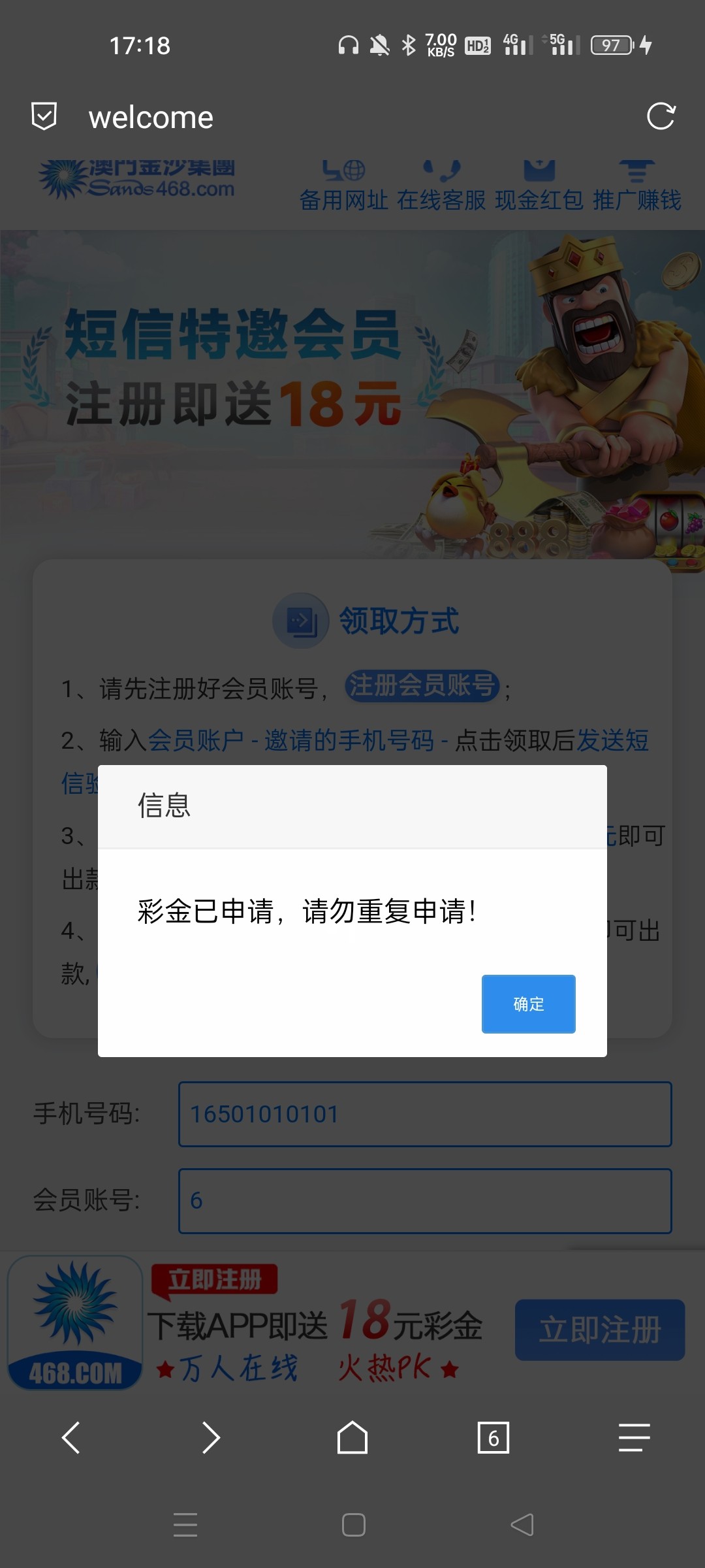 随便填个电话号码都显示已申请过彩金
