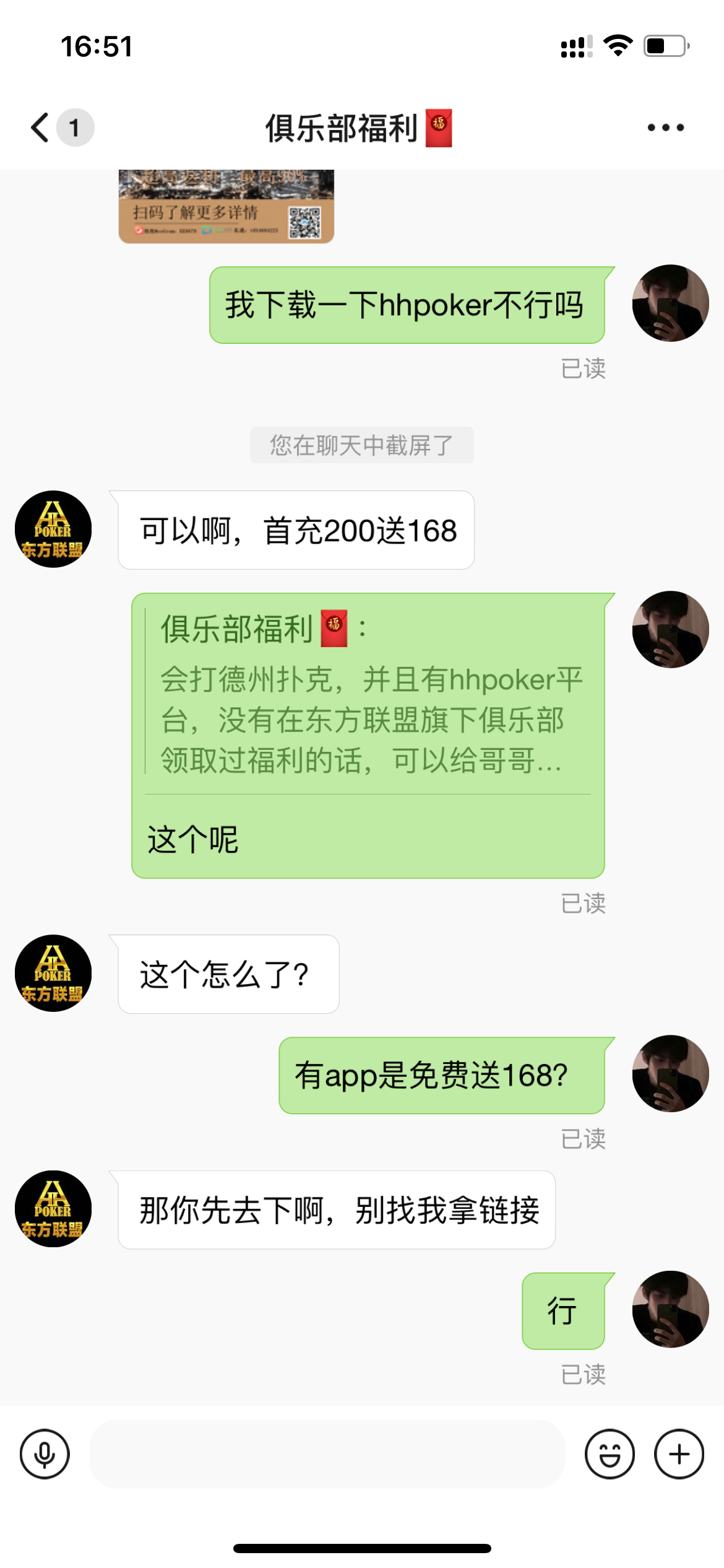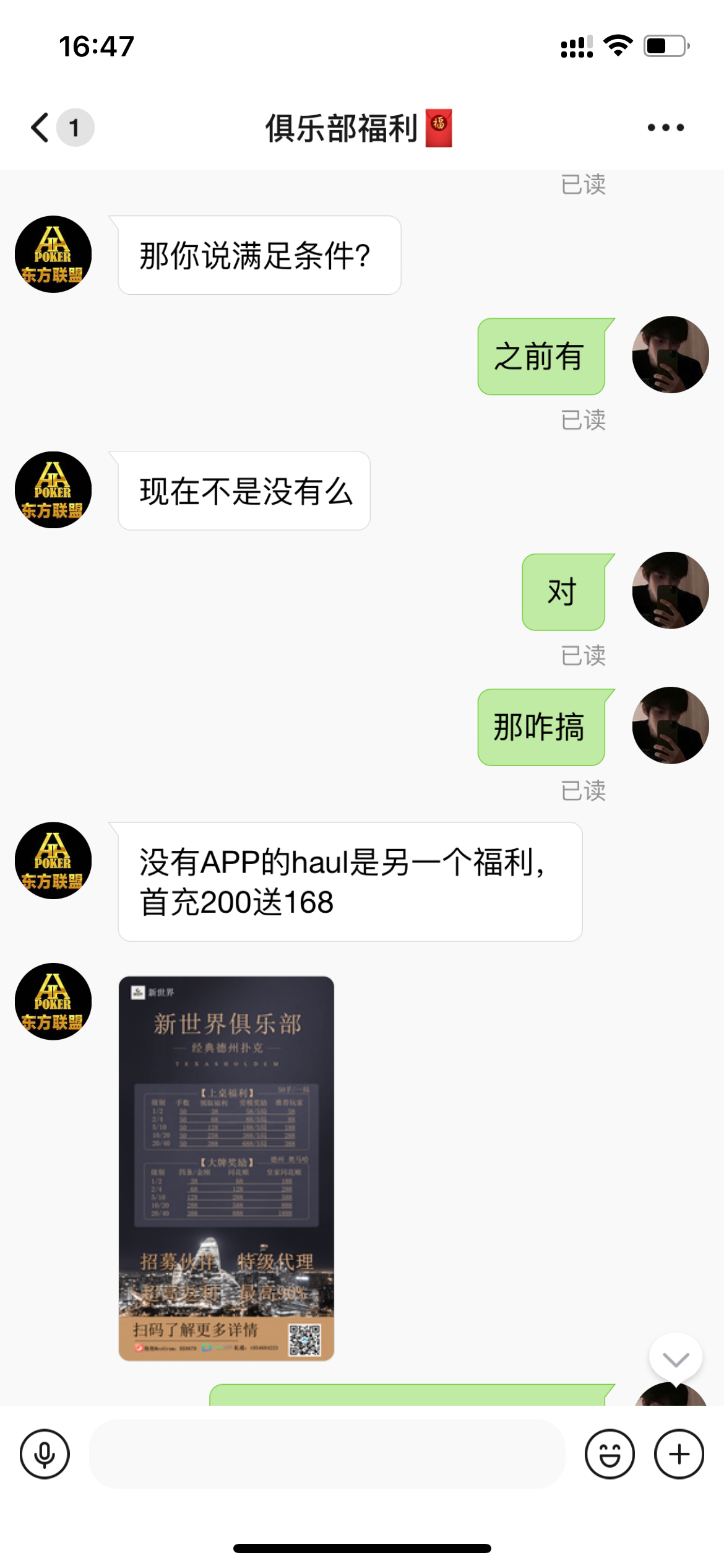 老板你好,德州扑克,德州牛仔,由于碰到薅羊毛大队,现联盟停止赠送168活动,开启首充200送168!要求简单!想参加可以联系我我推荐客服给您!