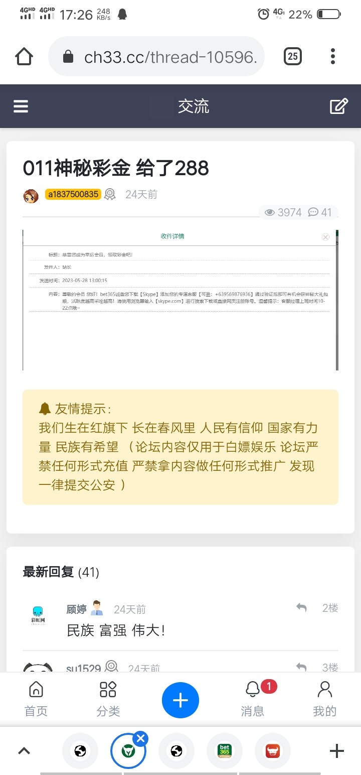 上次有人发出来加了skype的,去问他要彩金,亲测俩个号158