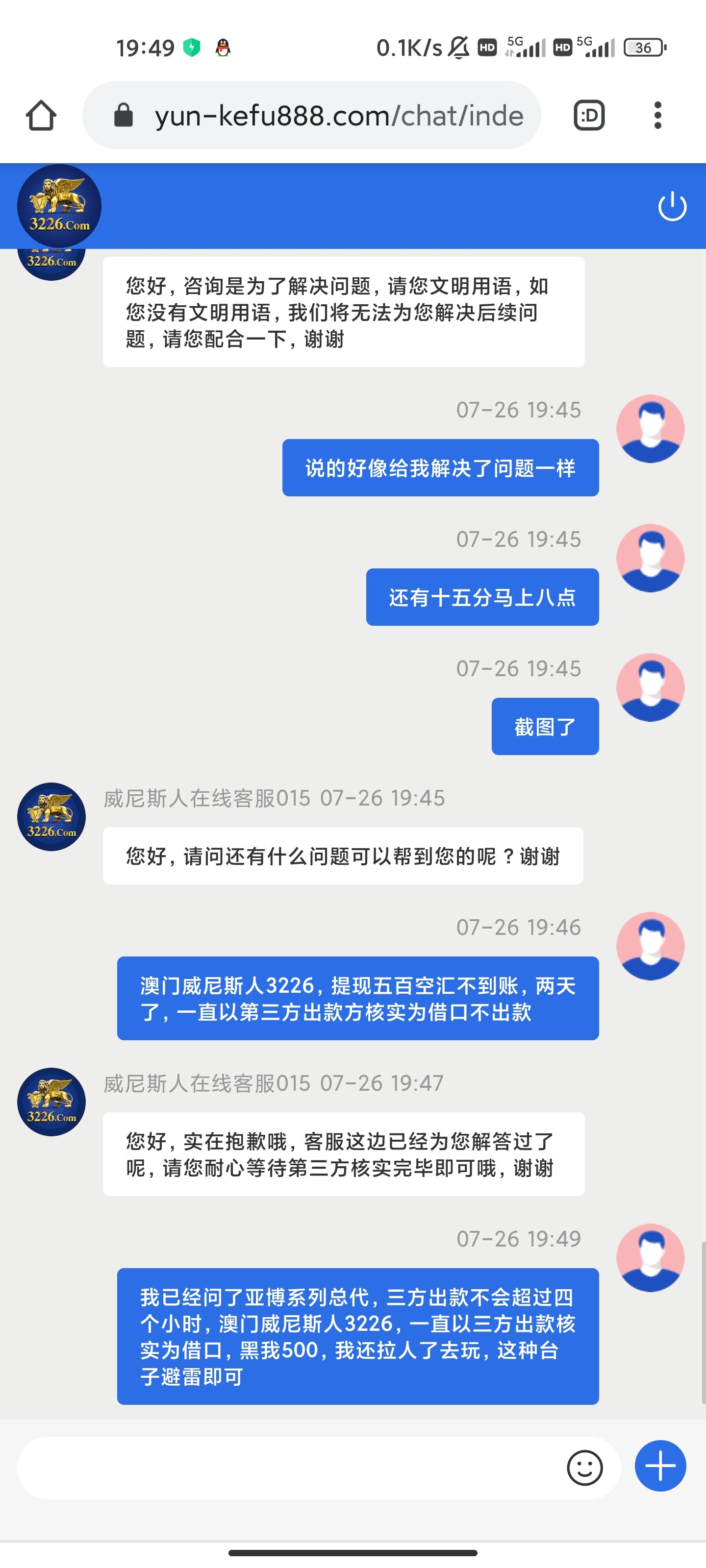 澳门威尼斯人3226,黑台子,两天了黑我五百不到账,一直以三方出款核实为借口,黑我500,应该是狗庄黑钱新话术甩锅给出款方,各位避雷!!