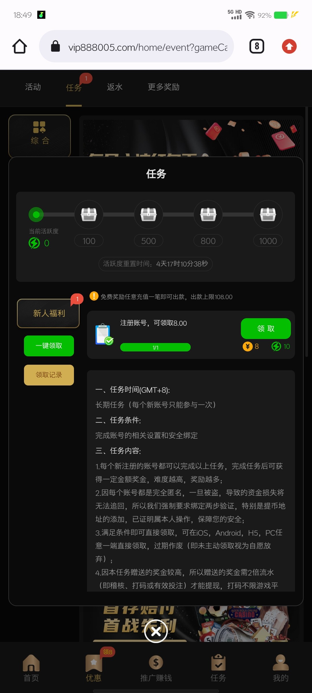 刚进去还能看到,你一注册领取就失败,然后任务那里就看不到了