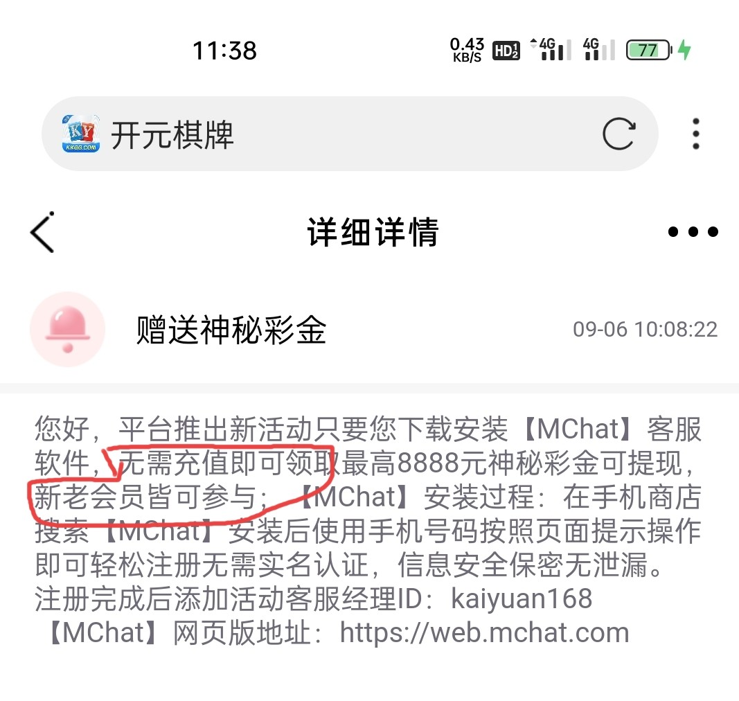下载MChat,添加kaiyuan168报ID和手机号,ID,不是账号,充值过的彩金更高,人多可能黄,不送无视即可,别在下面叫34969.gs