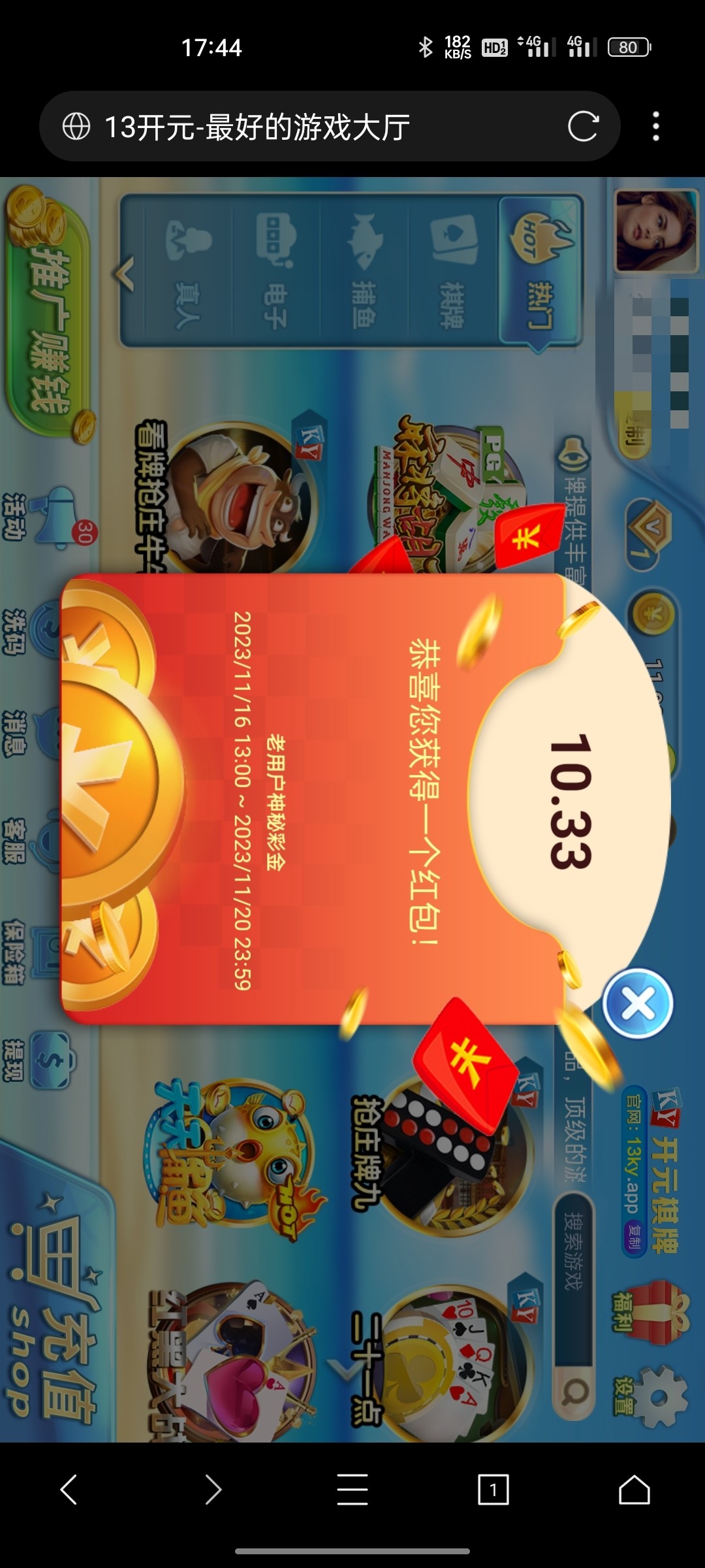 昨天五块多,出了620我直接傻了,进去麻将一块钱一发近爆了五百多,然后小奖来了一次就提了