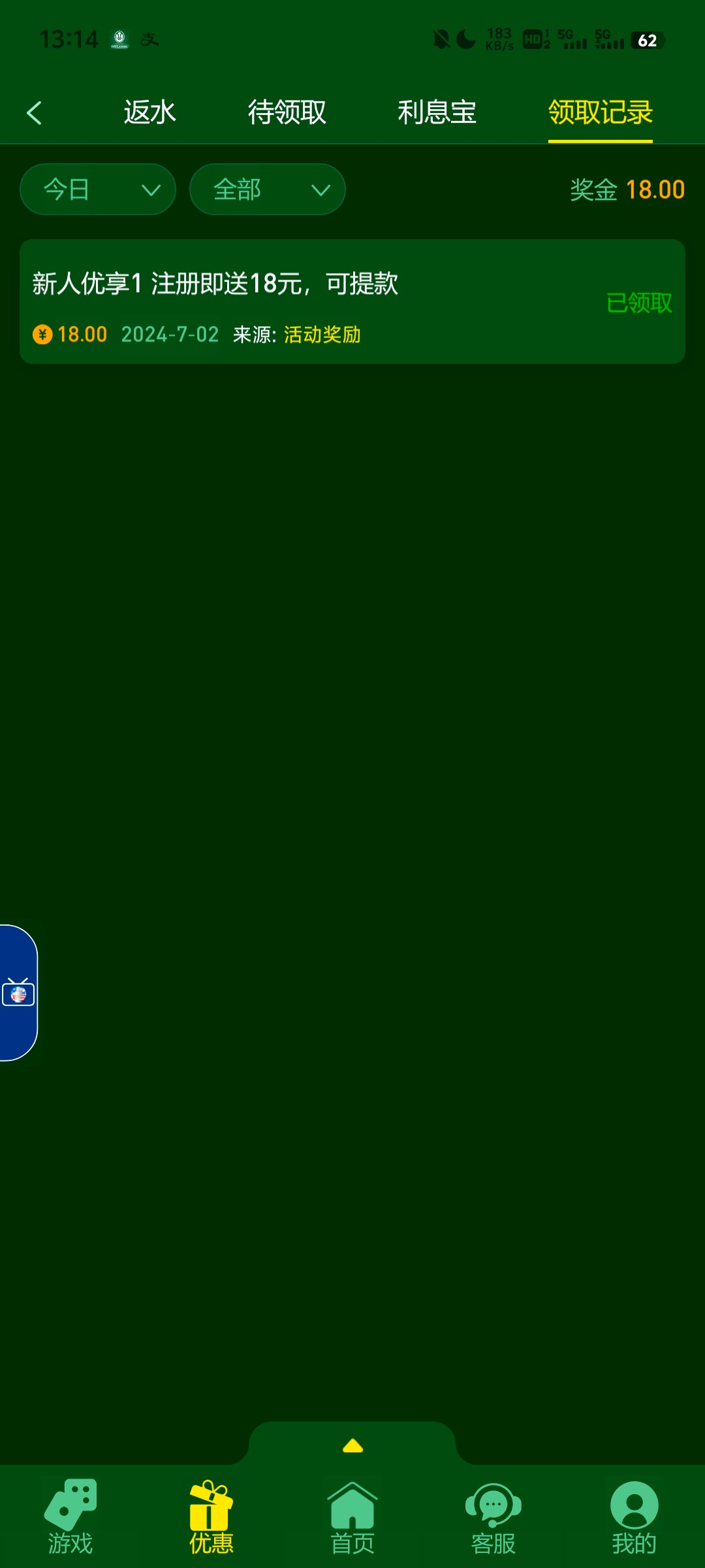 仅限注册24小时内注册的用户,符合条件的会员需要当日登入游戏账号>点击优惠>待领取>自助前往领取,领取仅限当日有效,逾期视为放弃,若待领取页面未显示任务选项说明不符合,谢谢