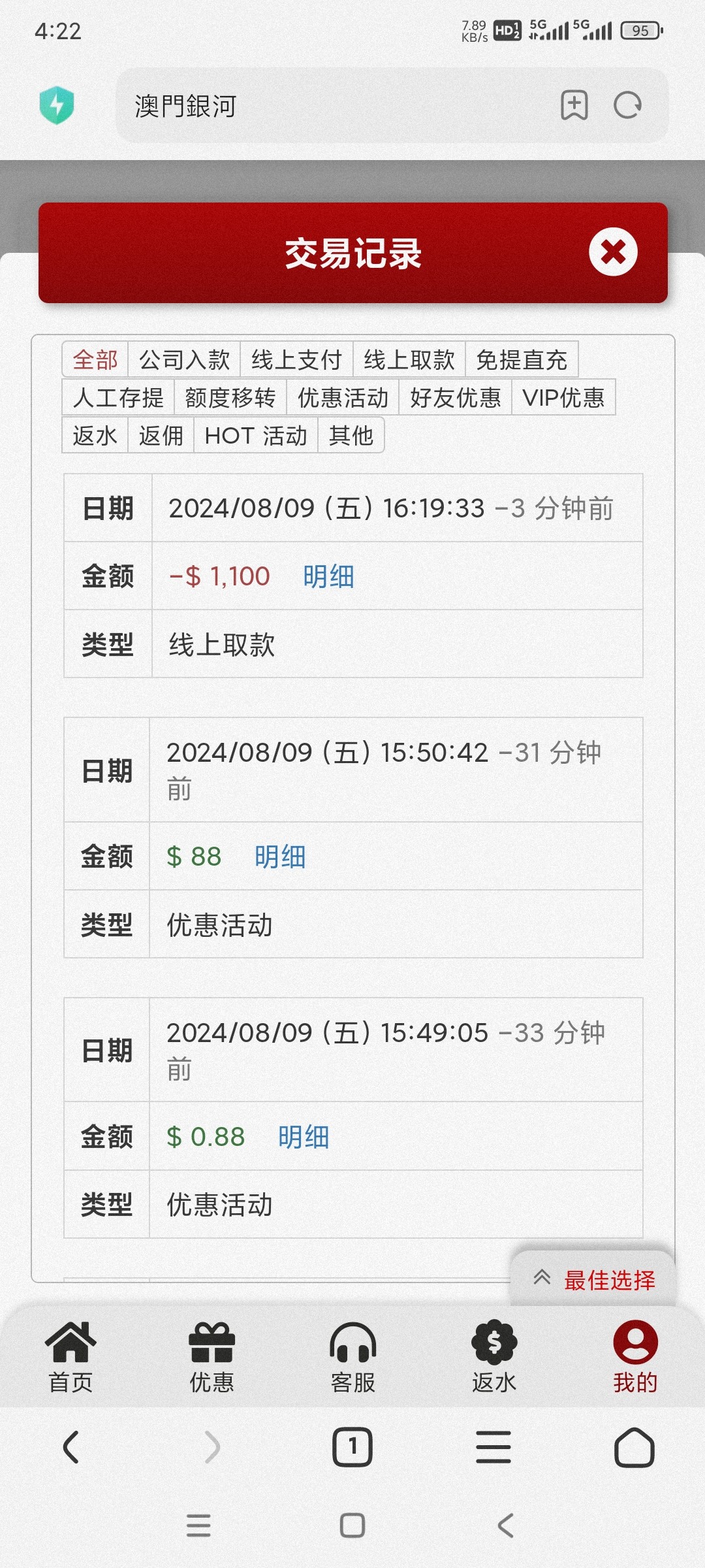 88+88拉6块麻1提1900,复存1千提1900,再复存一千提2900,三寸一千提2200,后面盈利5k送回去了,台子还行