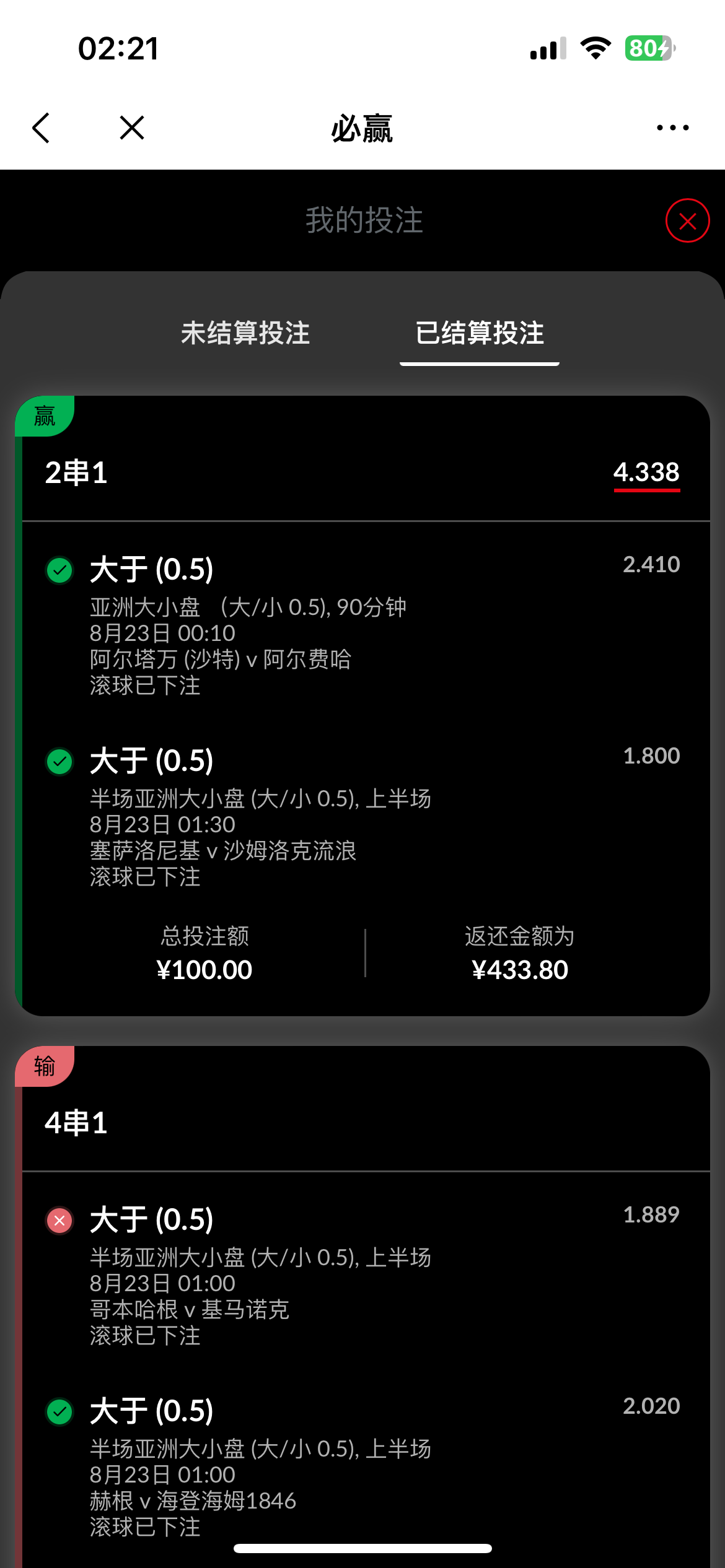 一手6串1没敢下大  就下了33块赢1200  有一场赢一半,要不然就是赢2000多了