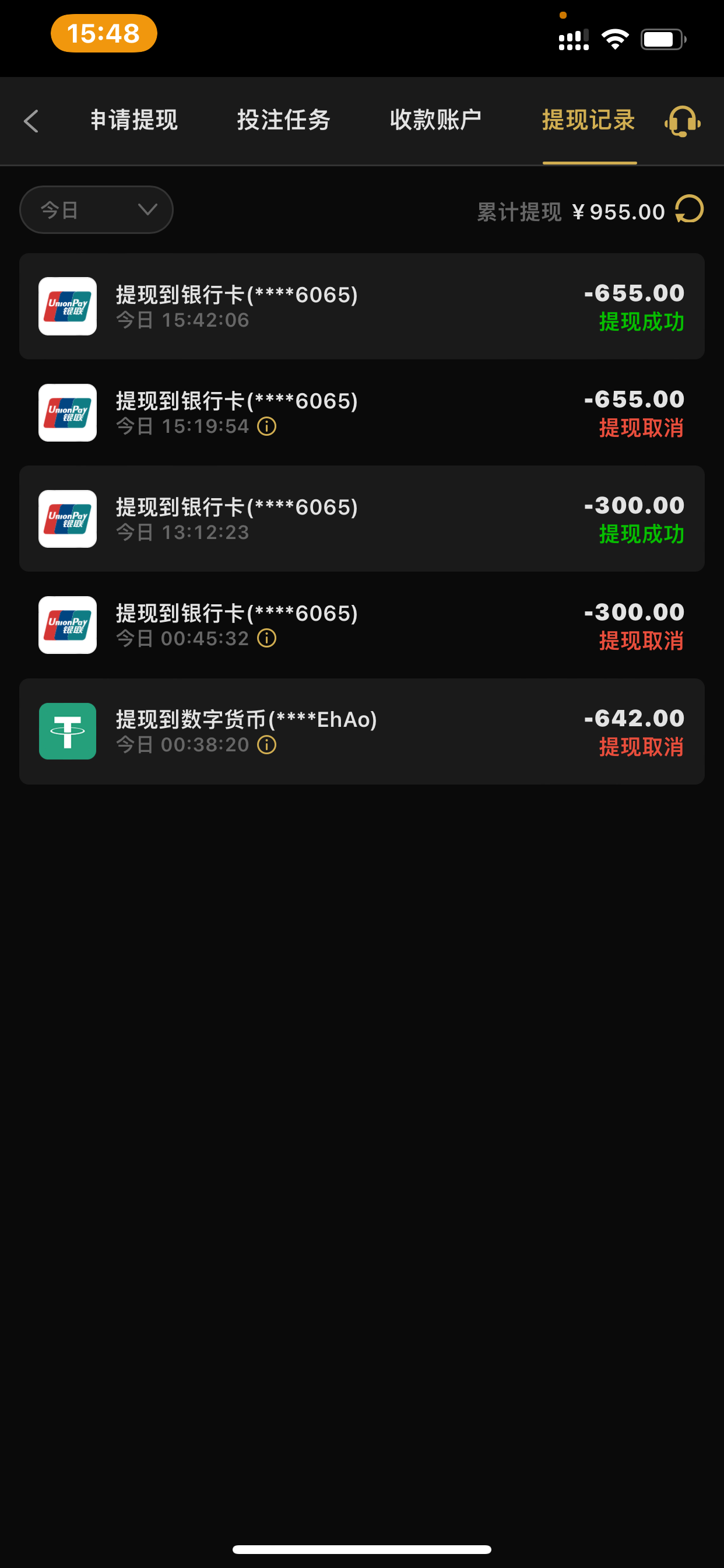 提600半个小时还没到账