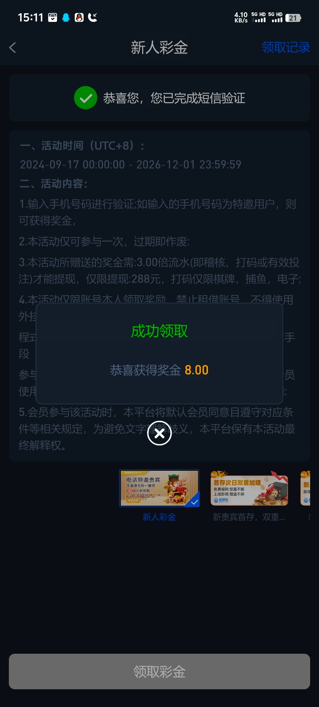 接到接电话去优惠活动里面申请,去验证看看,链接218.vc