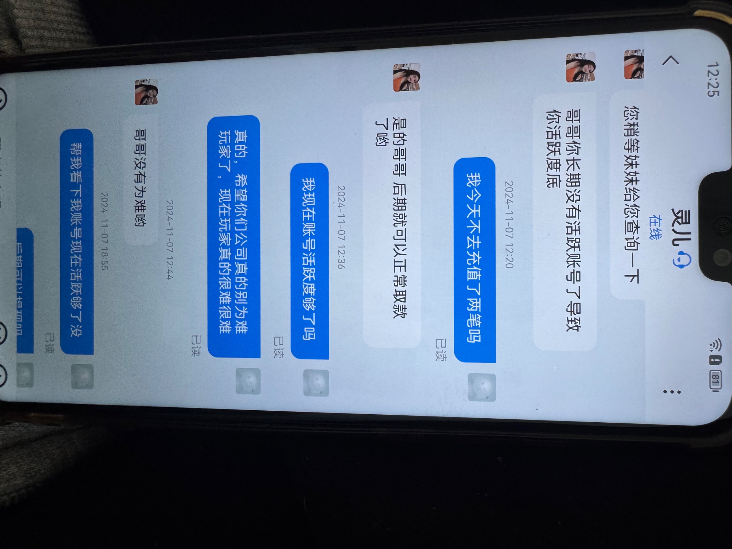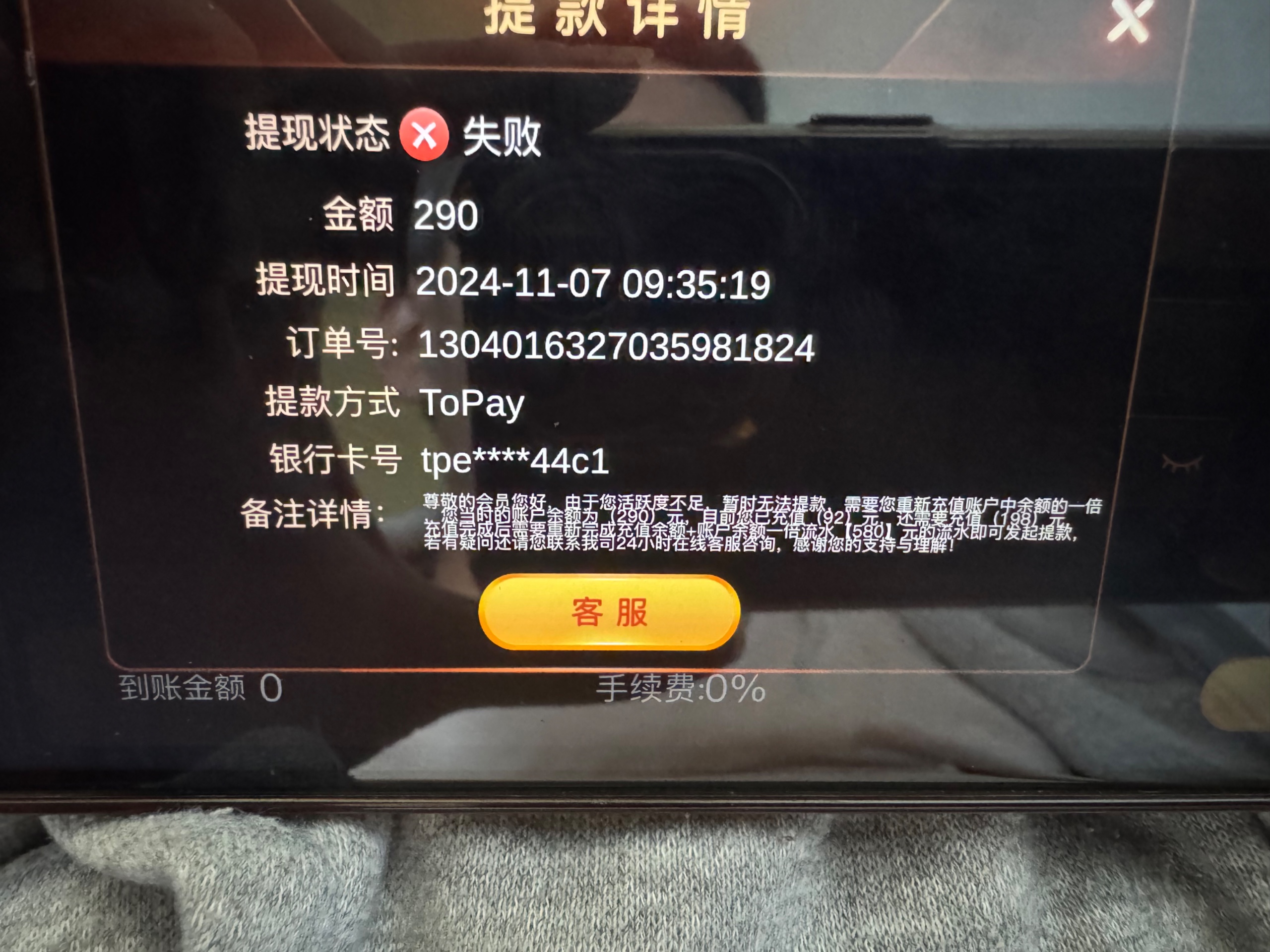玩了几年的平台,一直负盈利几万了,最近几个月没玩了,送了68彩金,然后提现200说我不活跃,让我充值提现的一倍金额完成一倍流水提现,然后充值后完成流水提现290,又说我不活跃,让我充值够290完成一倍打码提现。然后完成后又以注单没结算为理由拒绝。今天又说我活跃让我再次充值2100。现在网赌就是末路,当你开始玩的时候你就已经输了,这几年输了几百万。哪怕你赢了也不可能给你提现。哪怕你提现了银行取钱你也可能给各种查。现在有3000分收黑分的留下联系方式