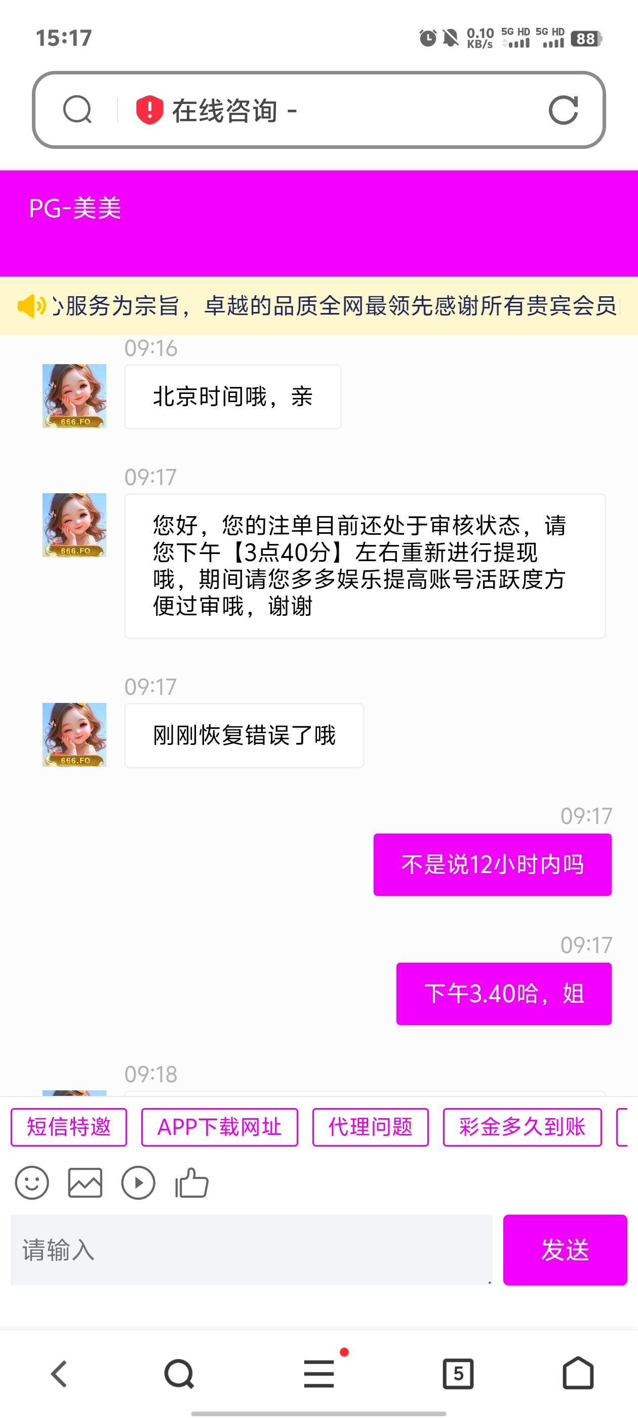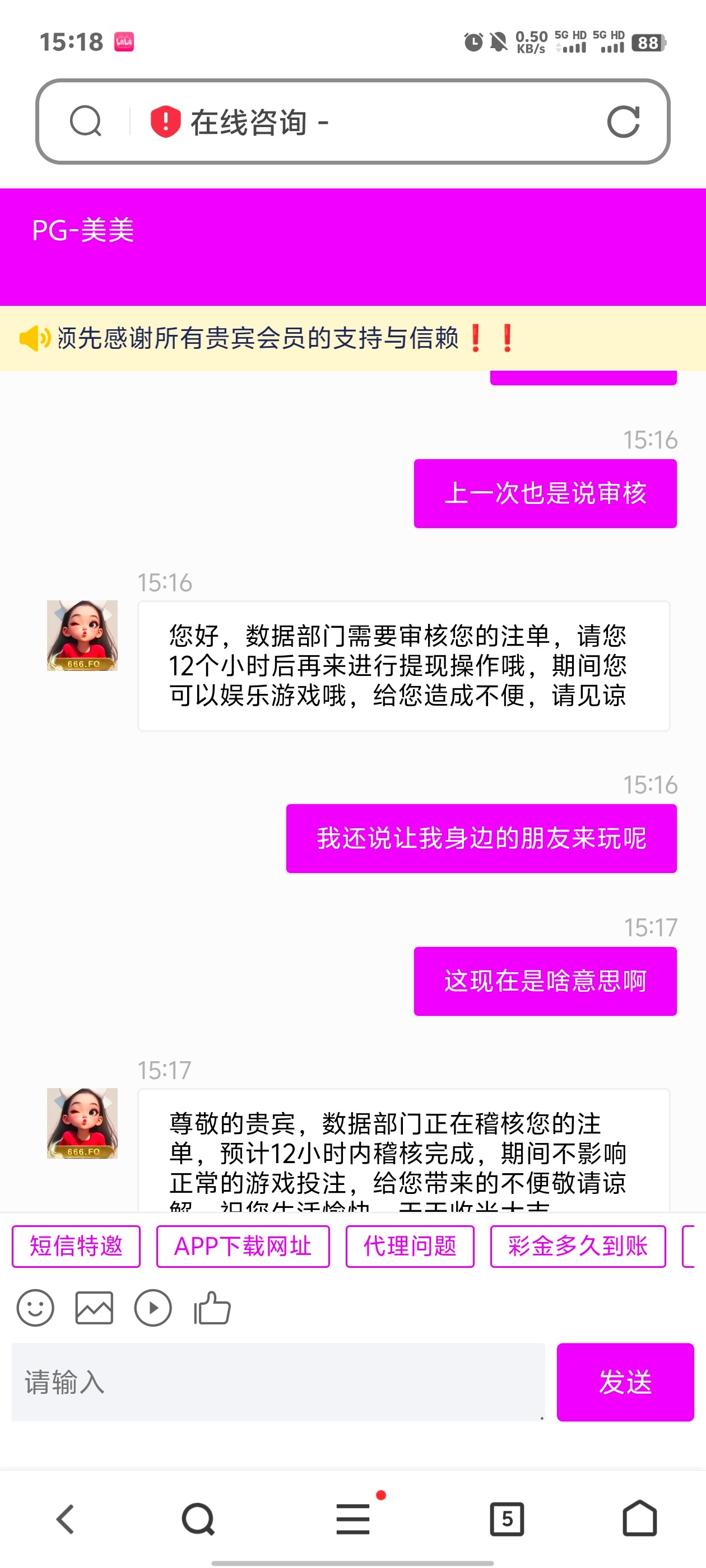 昨天晚上充值了500,然后打鱼打到3000提了,提示说审核部门审核,要12小时,早上起来我又问客服什么情况,她说让我下午提现试试,等到今天下午,12小时过了,我再去提现,又是这样的回复,我也跟客服说了提现到账了二存,喊朋友过来玩,问问老哥们这种情况怎么处理,处理好了一包华子