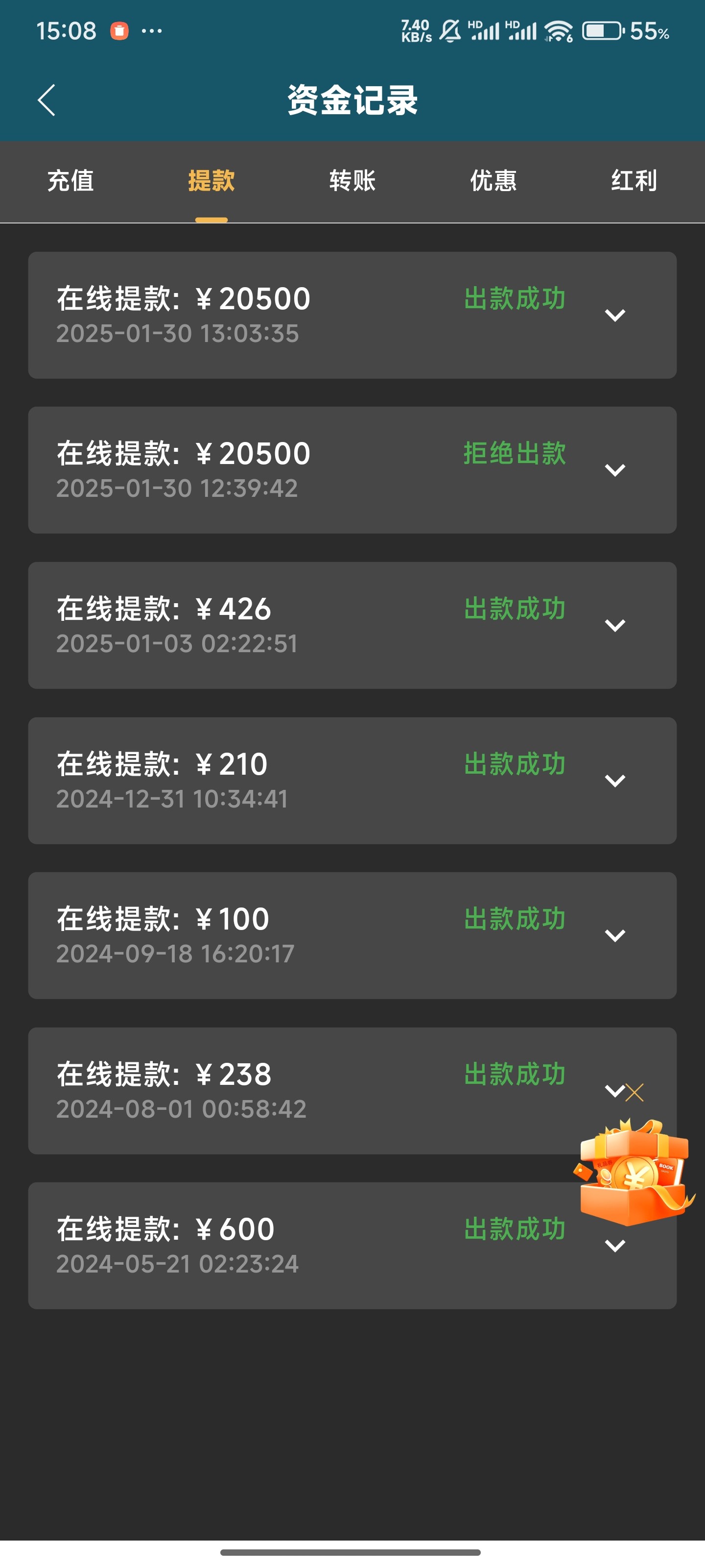 年前一直输了还欠债了,昨天又了借1k,打乐金城100%存送,1000+1000,拉pp出了两个,把贷款还清了剩1k,这个台子第一次出上万,还以为会黑,没想到给出了,果然还是无债一身轻啊,不团饭,也祝各位老哥早日上岸。