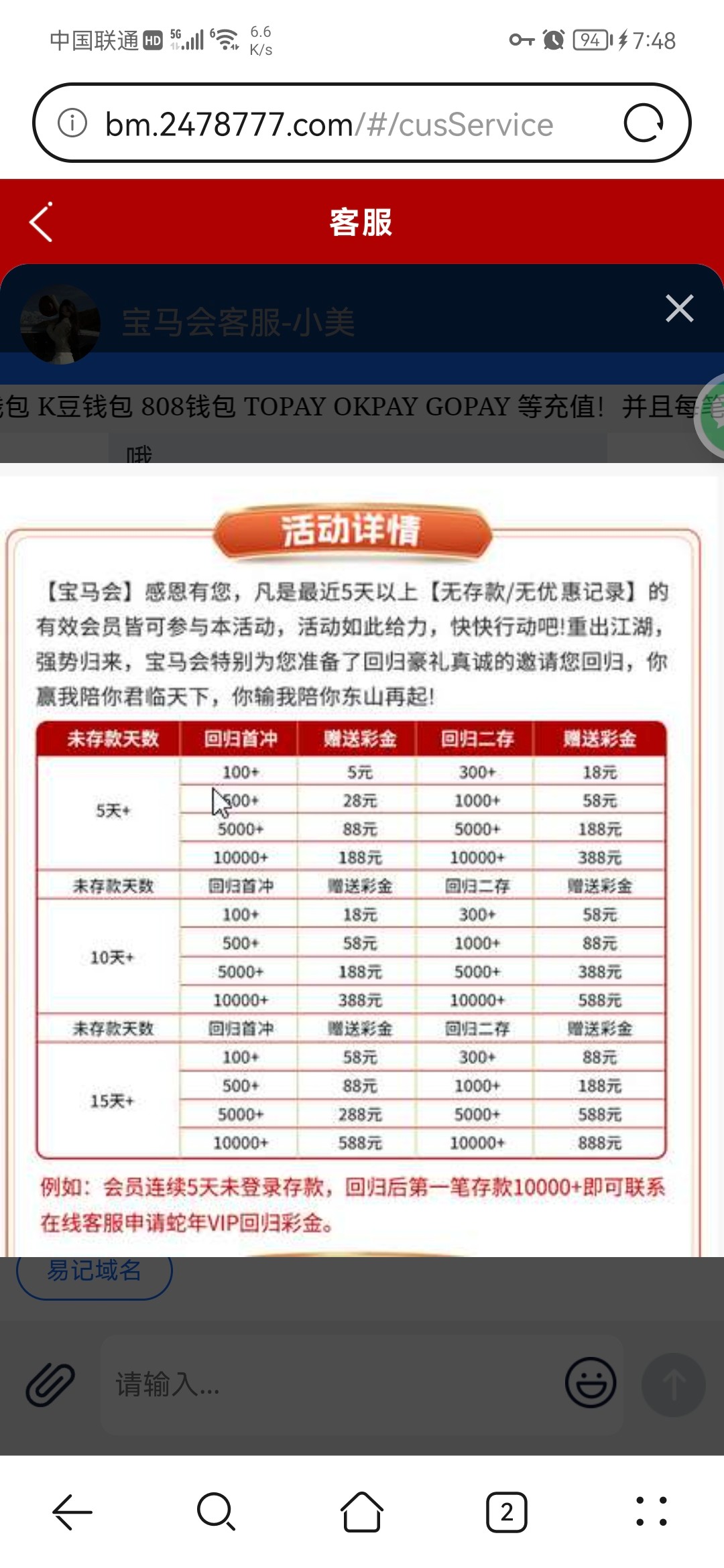 客服让我参加回归首存,不敢存,黑台太多了,不怕死的老哥可以上,