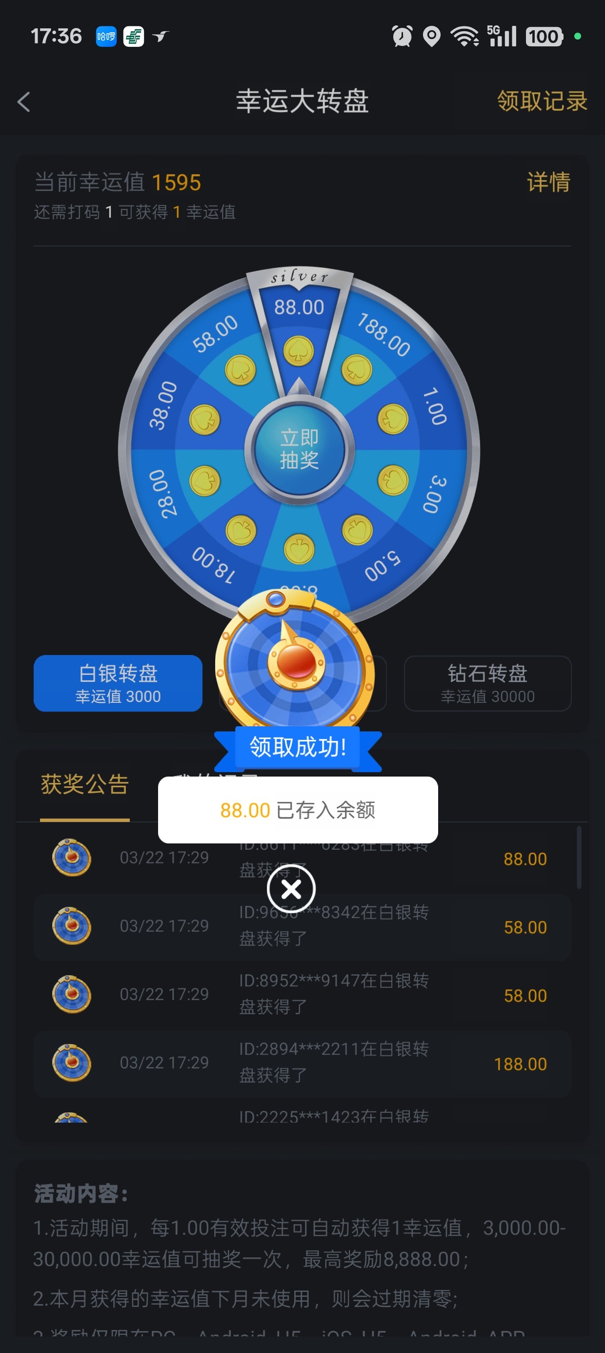 sb5588 100PG今天没打出领了十几块彩金打出380