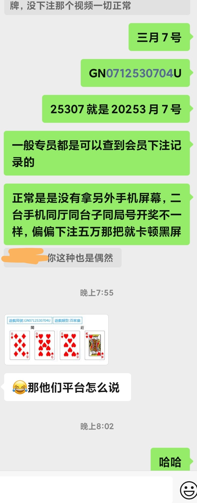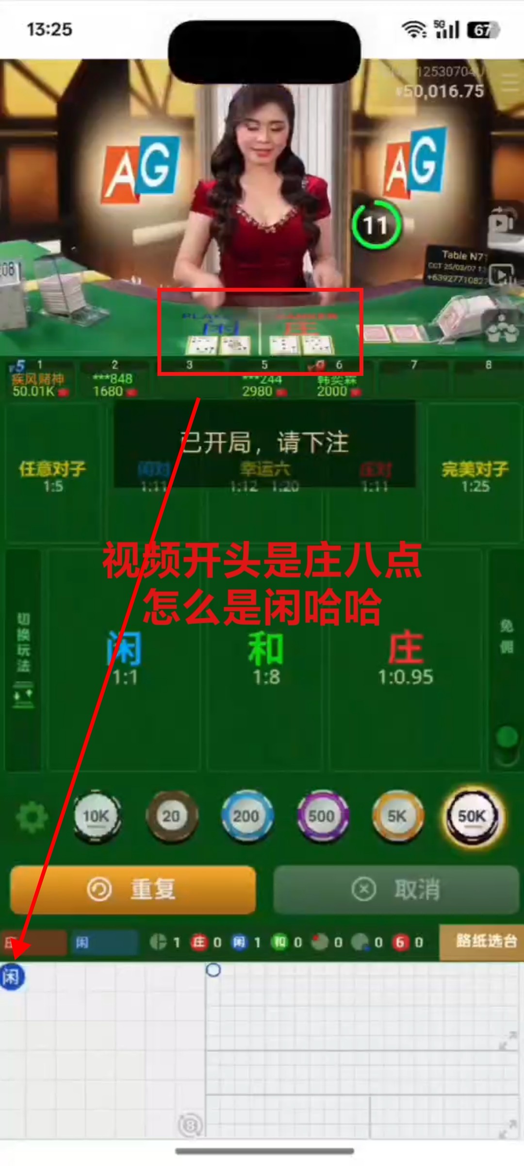 出生论坛这个ag二个视频说卡顿黑屏切换电子牌其实是p的局号我也找其他平台专员查来是GN0712530704U闲七点庄八点,二个视频第一个没有下注那个是p的,开完一局牌结算了是会跳局数的比如u就马上跳v,1就马上跳2那个视频没有从倒数13到12都没有。自从我看到这二个视频我是不是塌方了从2017年接触ag也下来五万一把连输十把那天挂壁22w。所以这三个夜晚一直去论坛希望找到有老哥下注那局的路珠,第一个视频是不开的前面一个蓝结果美女荷官是庄35八点怎么可能是闲。真踏马累给论坛老哥装逼几天熬夜。