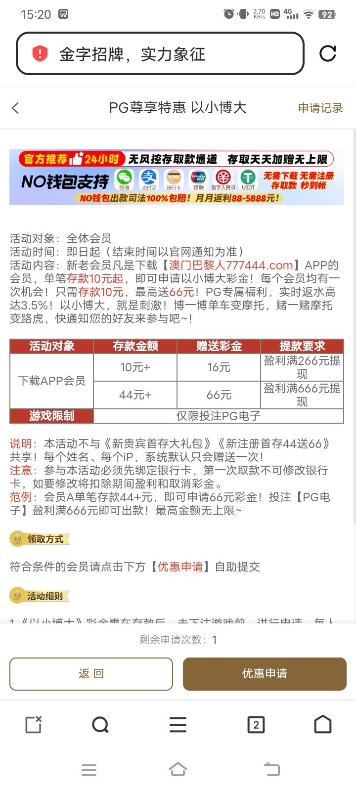 没打出来,充值了45申请了2个66,不知道黑不黑,自测吧。