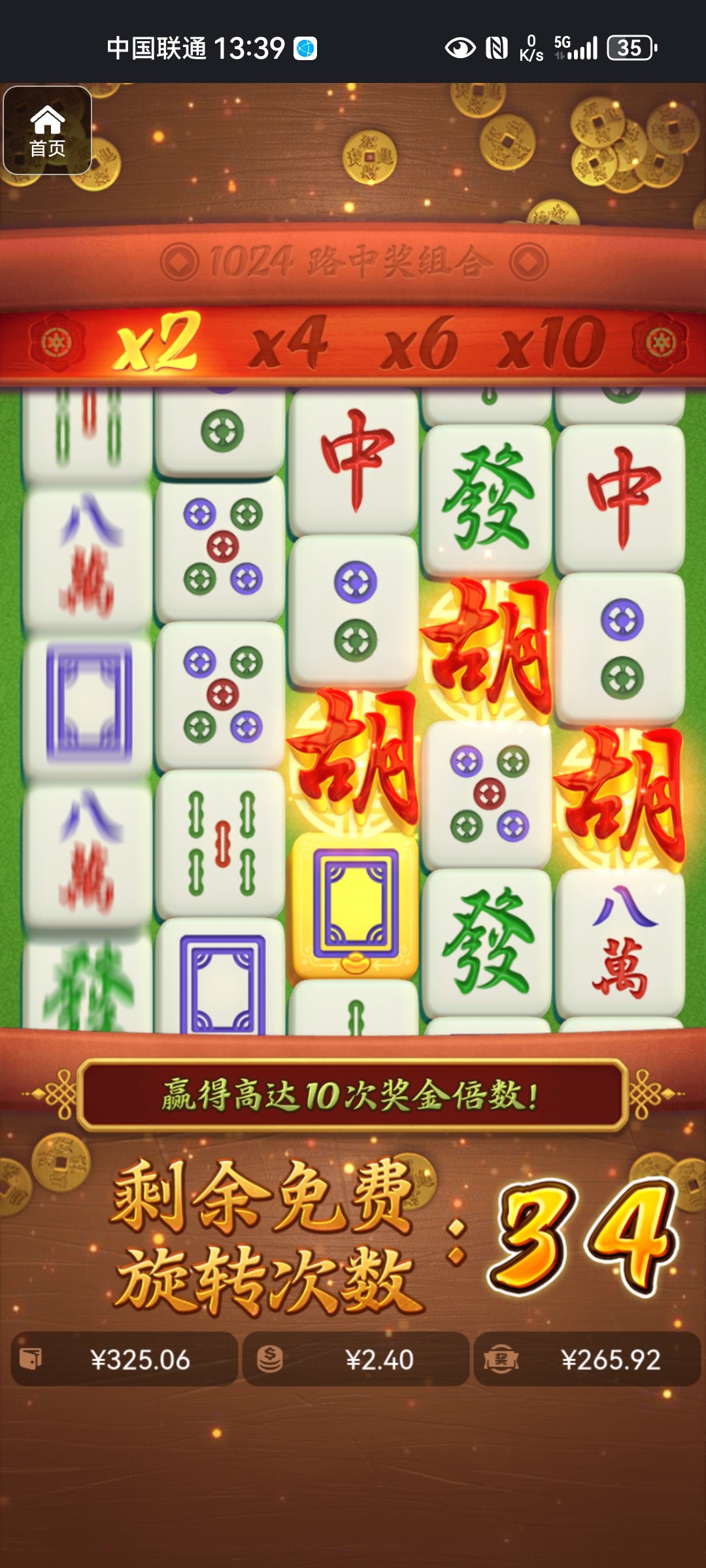三次免中免36次免费,爆了两百多倍,打流水马上要挂壁了,继续玩麻将又爆了,麻将真的有水