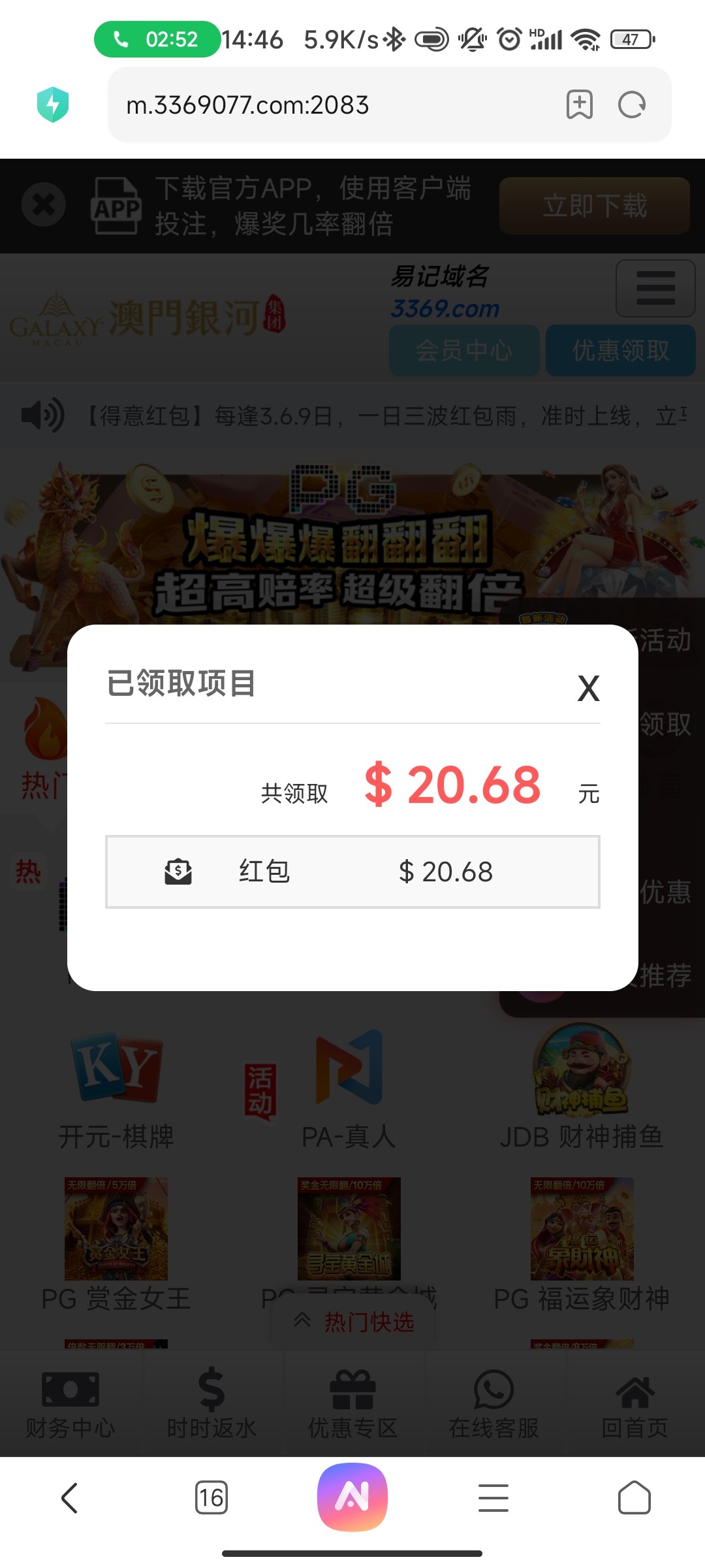 昨天2300上头输完,20打到1900流水一万,领了反水提现,今天20上188,提现藏了免费,在打首存,500一共白嫖588