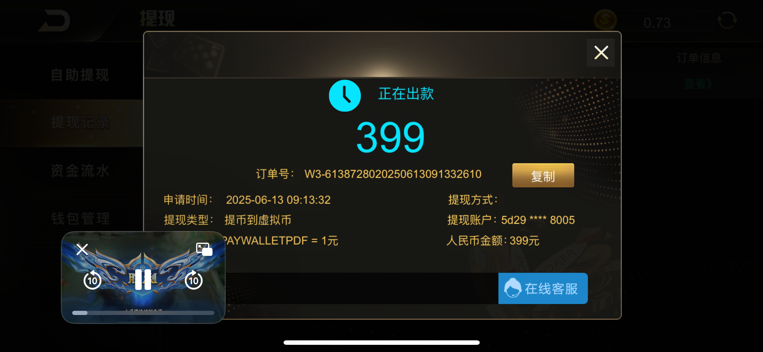 玩的冷门pg三天都给了,第二天才打了70出头水就提了被罚水了没办法,今天打了200水提现秒到,建议多打点水
