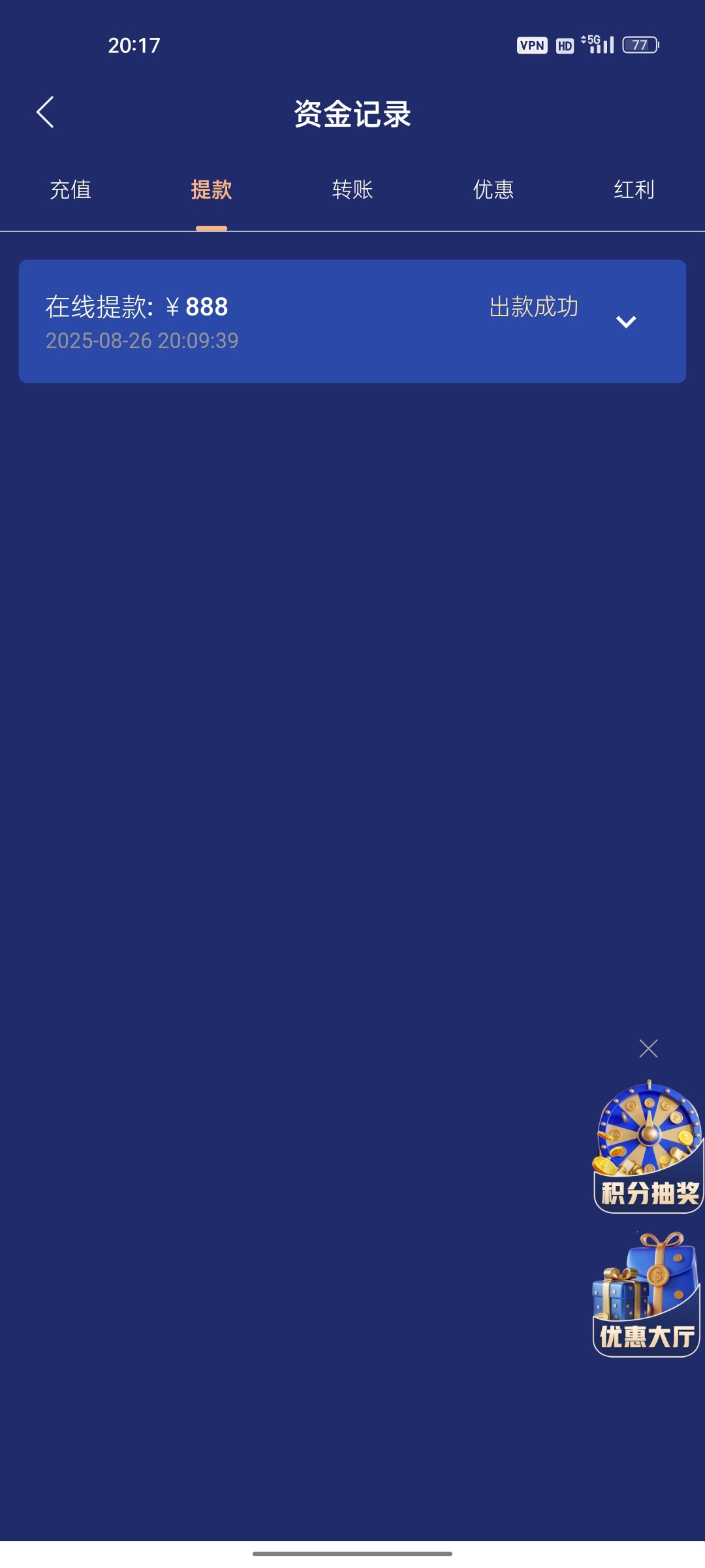 可惜只能提888还要扣手续费哈哈哈到账870