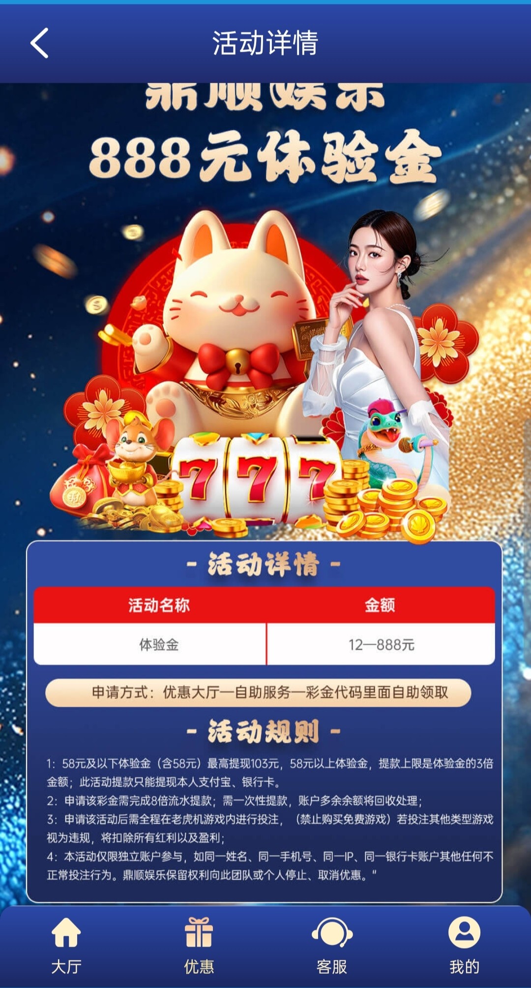 3、该活动仅限投注电子游戏,彩金提款上限103,多余金额需扣除,禁止购买免费游戏,藏分, 互转,违反扣除所有金币;