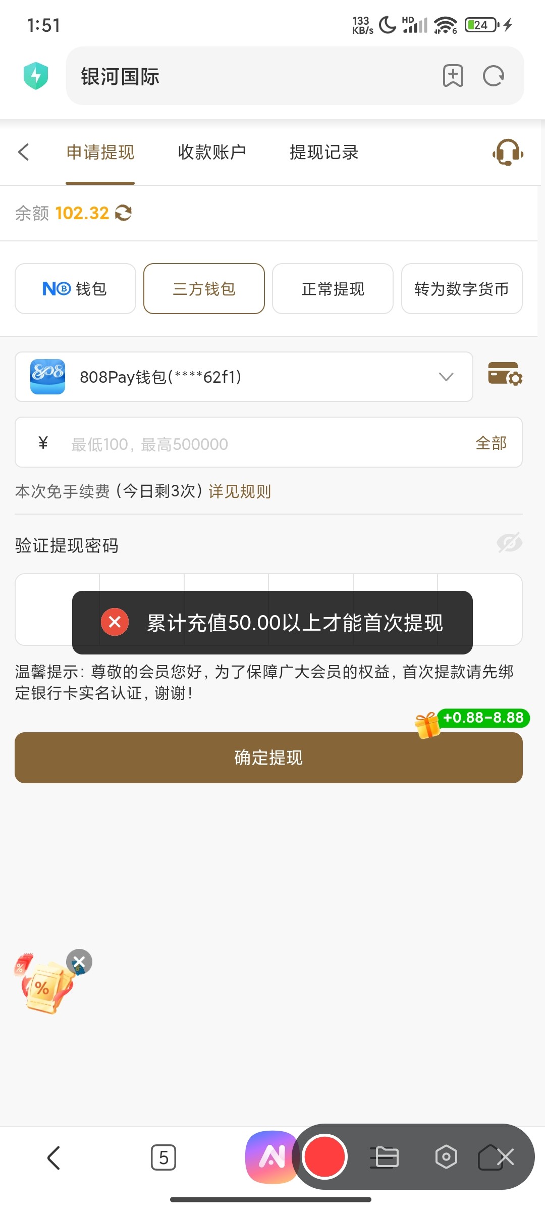 o需要充值50才能提现,充进去打水提了一张到账了