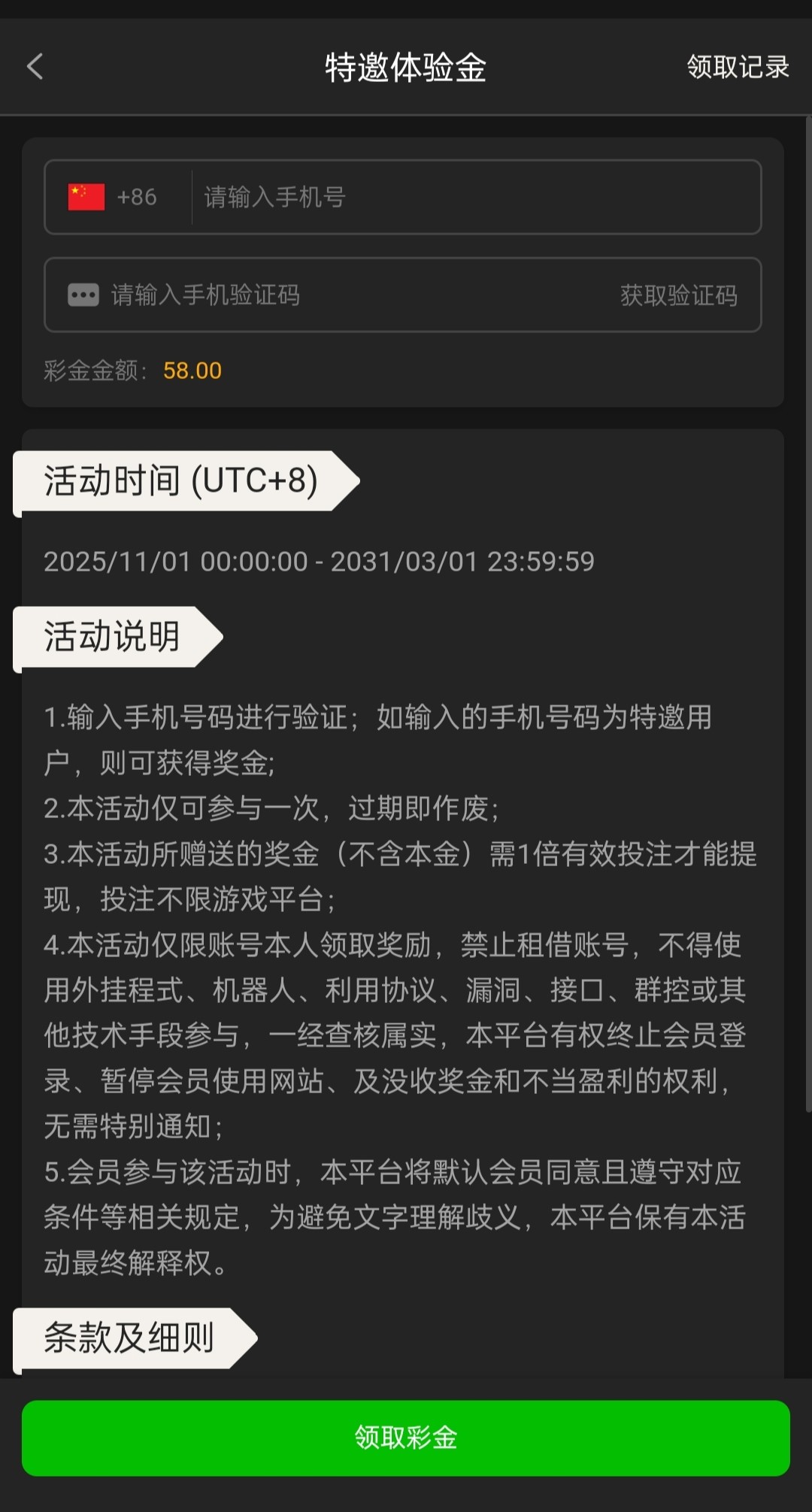 注册验证手机号自助领取58彩金,具体自测吧