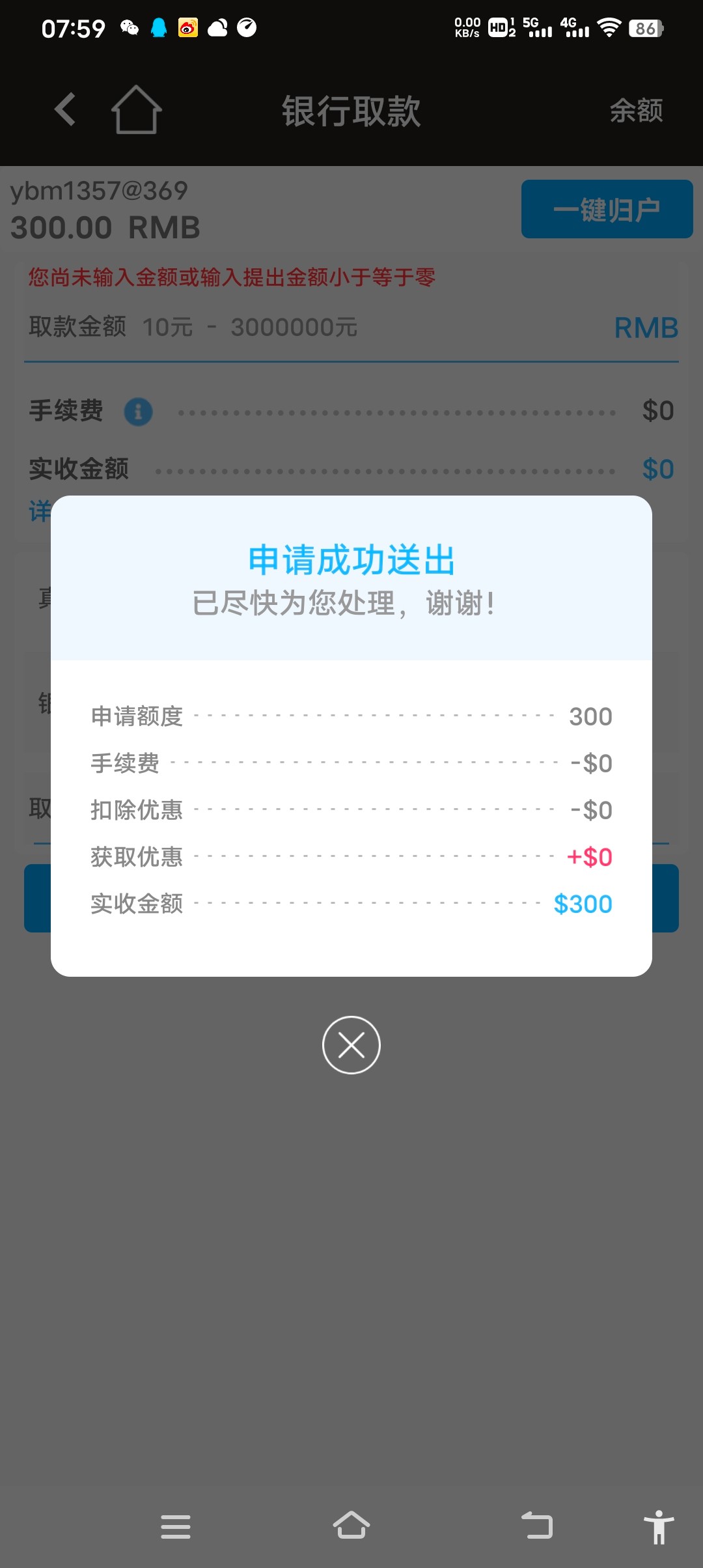 送了69,打出300,秒提现,秒到账。